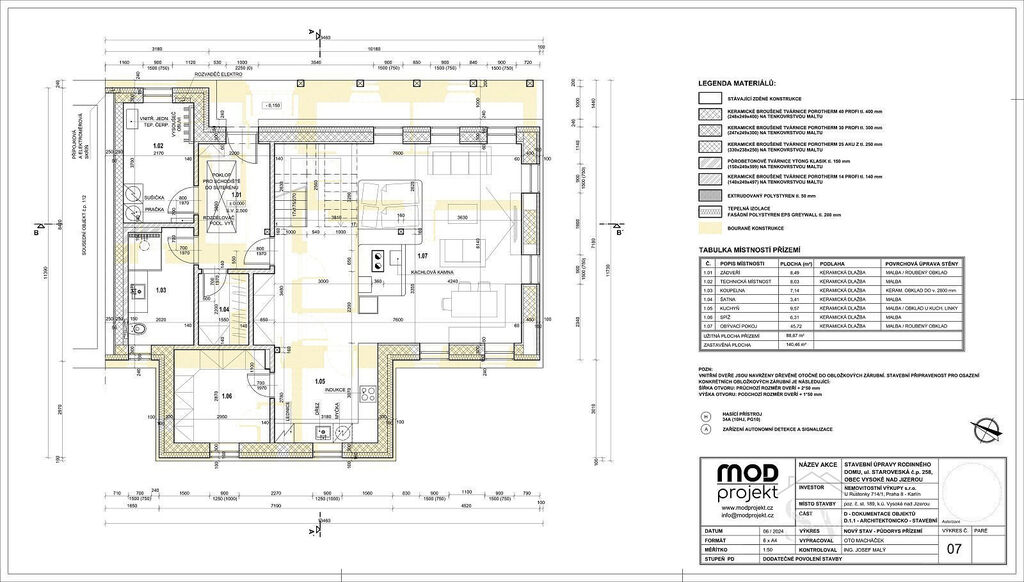 Přízemí (88,67 m²): zádveří, technická místnost, koupelna, šatna, spíž, kuchyň s jídelnou a obývací pokoj – dominuje luxusní kachlová kamna s ležením (6 kW).