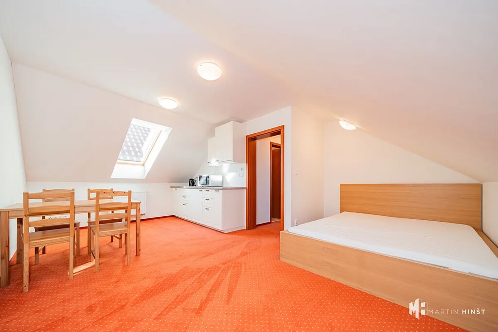 Nabízíme k pronájmu nezařízený byt o dispozici 2+kk v klidné obci Zlonín, který se nachází ve druhém patře patrového cihlového domu bez výtahu. Byt o celkové rozloze 45 m² je ideální pro ty, kteří hledají útulné a klidné bydlení s dobrou dostupností do Prahy. V bytě je k dispozici kuchyňská linka vybavená SK dvojvařičem, mikrovlnnou troubou a chladničkou. Dohromady se stolem a židlemi tvoří praktickou jídelní část. V ložnici je k dispozici postel a dostatek úložného prostoru. Koupelna je vybavena vanou, zatímco WC je umístěno samostatně. Vytápění a ohřev vody jsou zajištěny centrálním plynovým kotlem, který je sdílený s pekárnou umístěnou v přízemí domu.