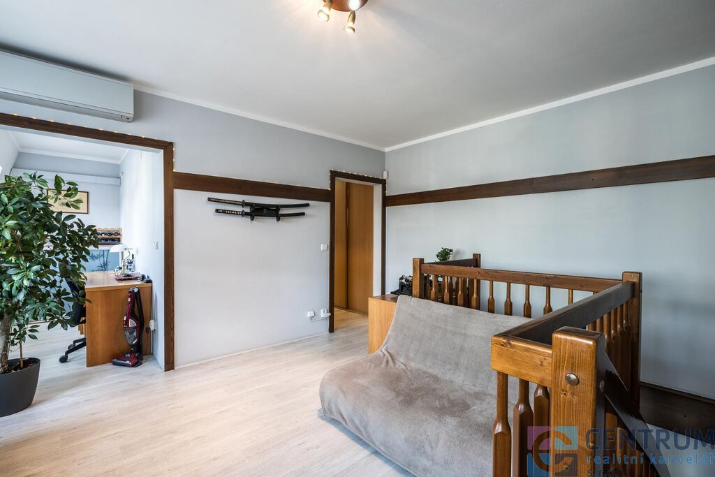 Byt vznikl vertikálním spojením dvou jednotek o dispozici 2+1, které lze v případě zájmu vrátit do původního stavu. Aktuální konfigurace nabízí pohodlné rodinné bydlení zejména díky dvěma koupelnám, pracovně, šatně a prostornému obývacímu pokoji. K propojení obou podlaží slouží příjemné dřevěné schodiště, které navazuje na pokoj určený pro posezení/relaxační zónu - tento prostor navazující na pracovnu lze snadno přizpůsobit individuálním potřebám. Každá z ložnic disponuje vlastní lodžií z toho horní je zasklená a vybavená elektricky ovládanou markýzou. Navíc je byt vybaven klimatizací. V obývacím pokoji a kuchyni je pro větší komfort podlahové topení