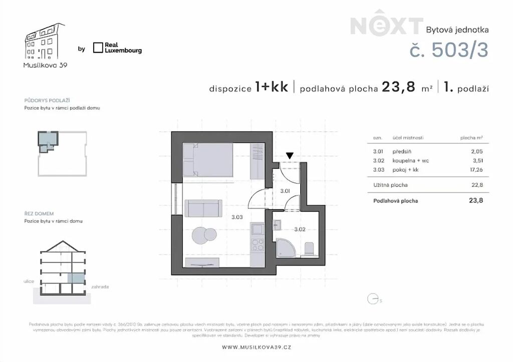 Byt o podlahové ploše 23,8 m2 se skládá z pokoje s kuchyňským koutem (17,3 m2), předsíně (2 m2) a moderní koupelny (3,5 m2) se sprchovým koutem a WC. Je umístěn v 1. nadzemním podlaží kompletně rekonstruovaného 3 podlažního domu v ulici Musílkova, s velkým oknem s výhledem do zahrádek za domem. K domu je možné zahrádku přikoupit.