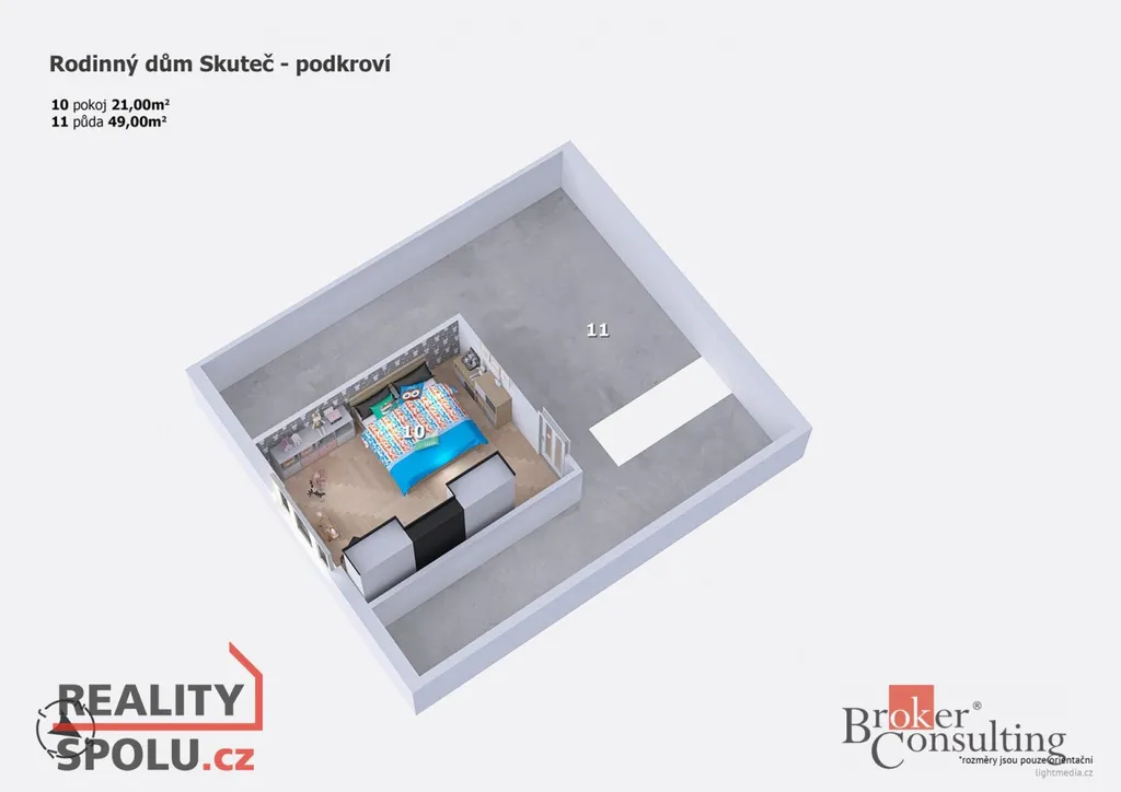 Dispozičně dům nabízí v přízemí kuchyni, obývací pokoj, další samostatný pokoj a koupelnu. V patře se nachází jeden prostorný pokoj a po obou stranách dva půdní prostory, které lze využít například jako úložné prostory nebo je stavebně upravit. Celková dispozice domu je 3+1 s užitnou plochou 82 m², přičemž půdní prostory nejsou do této plochy započítány.