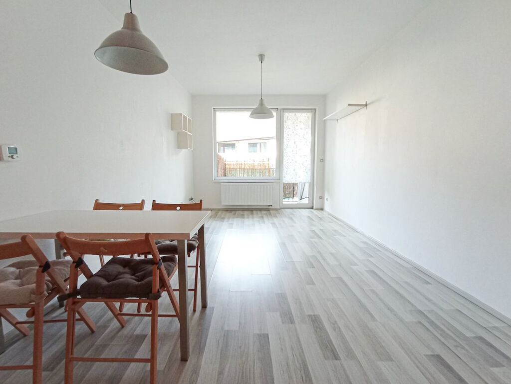 Prostorný pokoj s kuchyňským koutem, k bytu náleží také balkon.