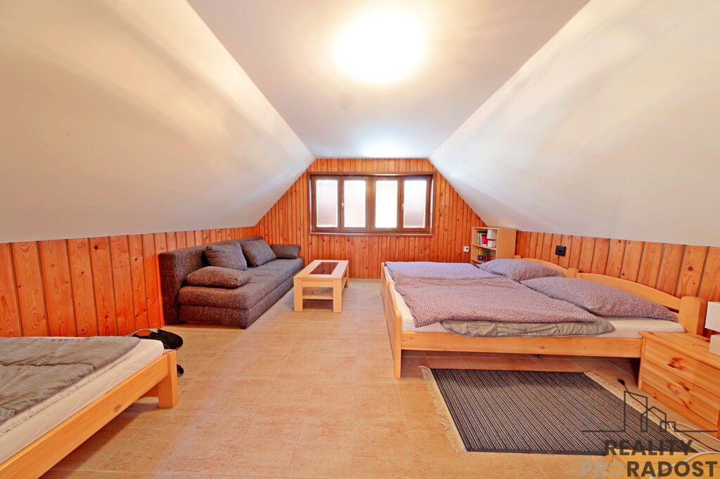 2. nadzemní podlaží – klimatizovaný pokoj s pěti lůžky, sedací soupravou, koupelna se sprchou a WC, relaxační kout.