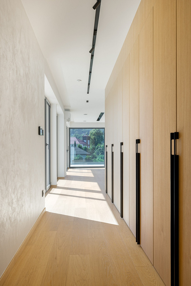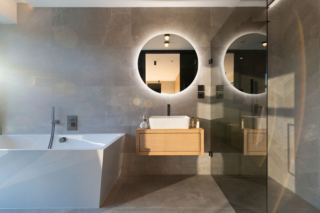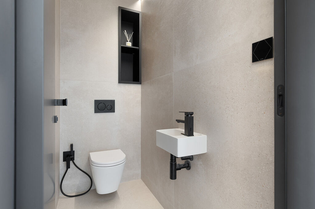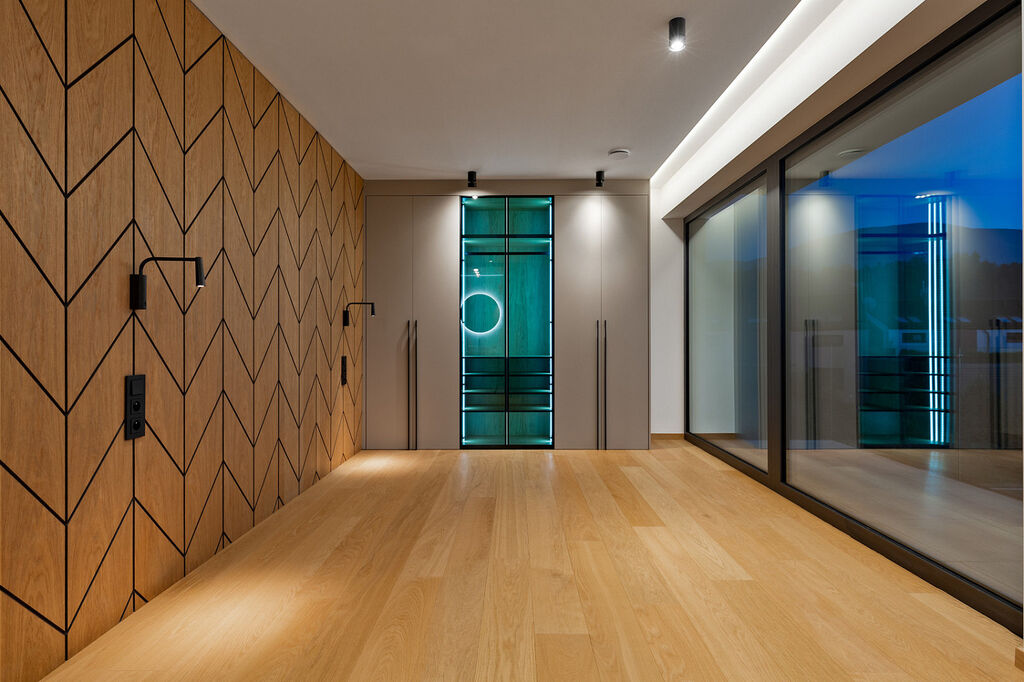 Hlavní ložnice ukrývá luxusní koupelnu za kouřovým sklem, s volně stojící vanou a výhledem na hory. Druhá koupelna, samostatné WC a další dva pokoje pak poskytují prostor pro rodinu, hosty či pracovnu. Napříč celým bytem najdete dubové podlahy, vestavěný nábytek na míru a prémiové italské materiály, které dodávají interiéru charakter i nadčasovost.