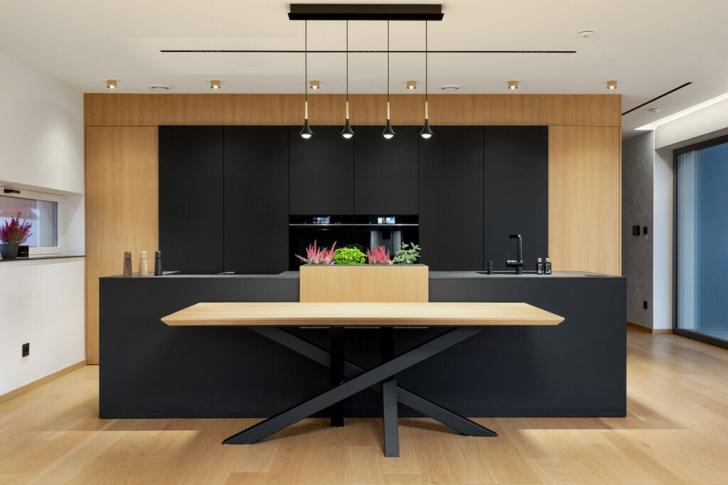 Dominantou bytu je velkorysý obývací pokoj s kuchyní na míru a vstupem na jihozápadně orientovanou terasu. Kuchyň je vybavena špičkovými spotřebiči Siemens včetně parní trouby a kávovaru, integrovaným odsavačem par, neviditelnou spíží a pracovní deskou FENIX, která nezanechává otisky. Dubová dýha a chytrá světla ovládaná přímo z pracovní desky jsou jen ukázkou toho, jak promyšleně je interiér navržen.