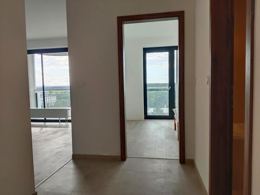 Byt je umístěn v devátém patře moderní budovy, což zaručuje krásný výhled z balkónu západním směrem na Borský park a dokonce i na vrcholky Šumavy.