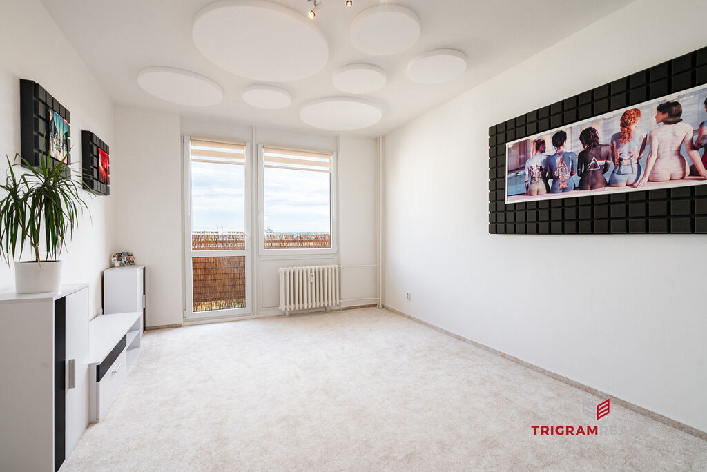 Zprostředkujeme prodej moderně zrekonstruovaného bytu 3+1 o velikosti 84,36 m² se čtyřmi lodžiemi. Byt je umístěn v 9. patře částečně zrevitalizovaného panelového domu na třídě Edvarda Beneše, v klidné části Moravského Předměstí. Orientace do dvou světových stran zajišťuje velmi dobré osvětlení a snadné větrání. Z dětského pokoje a ložnice se otevírá výhled do parku.