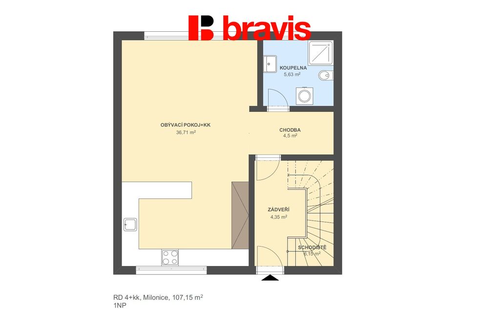 V přízemí najdete vzdušný a světlý obývací pokoj spojený s moderním kuchyňským koutem (37 m²).