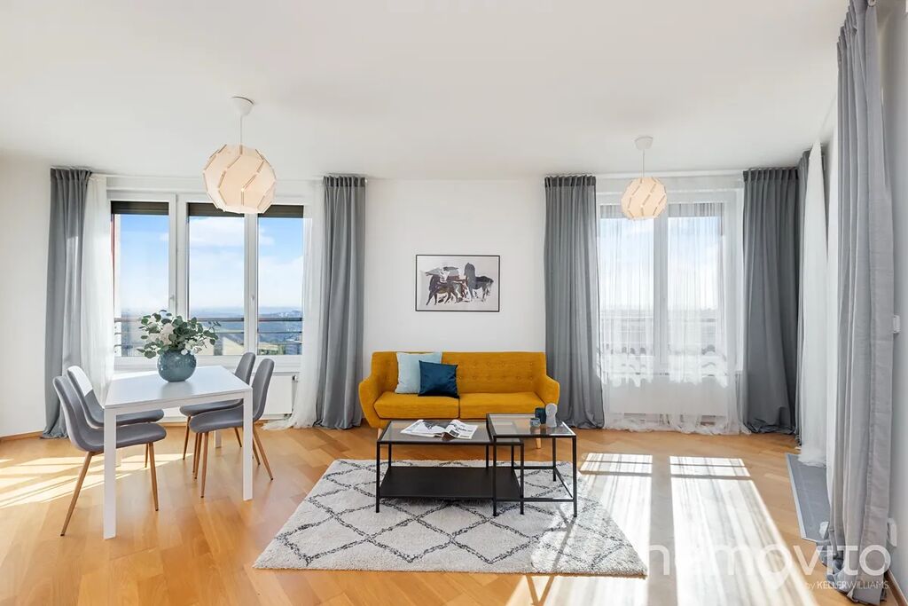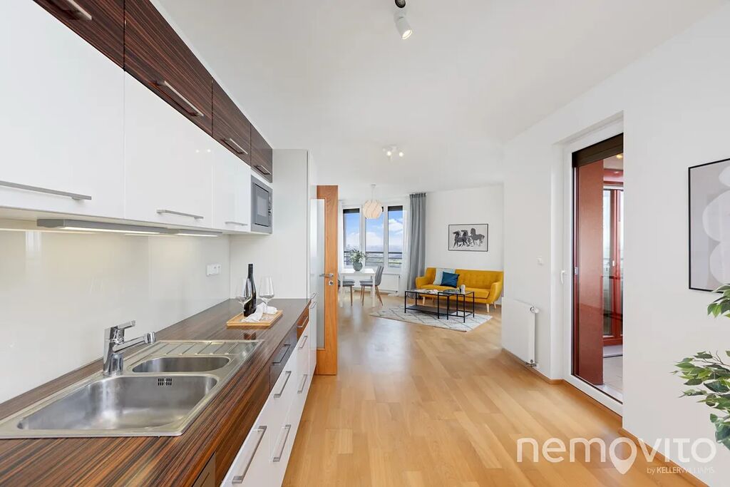 Proti původní dodávce developera byl byt vybaven nadstandardně - jiné podlahy, jiné provedení koupelny a WC. Zdaleka nejzajímavější je však to, co je umístěno za velkoformátovými okny (s roletami). Panoramatický výhled z východně položené věže projektu je skutečně působivý. Byt je umístěn v jižním cípu věže, je tedy příjemně světlý a působí velmi vzdušně. Obývák má 36 m2, okna kolem dokola, výstup na balkon a kuchyňský kout umístěný v opticky oddělené sekci.