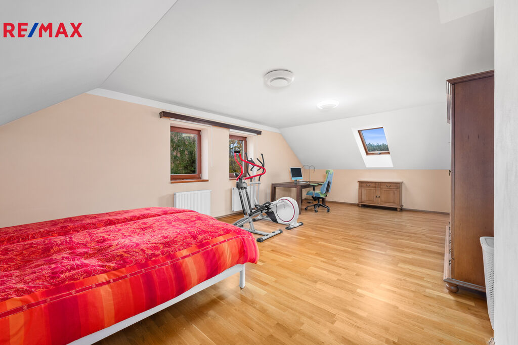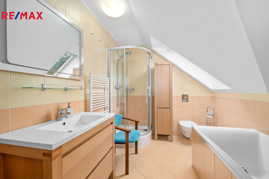 Podkroví: tři samostatné ložnice a velká koupelna s vanou, sprchovým koutem a WC.