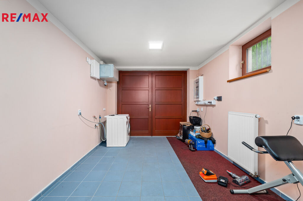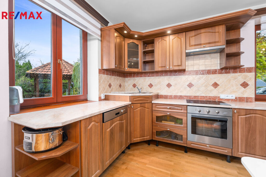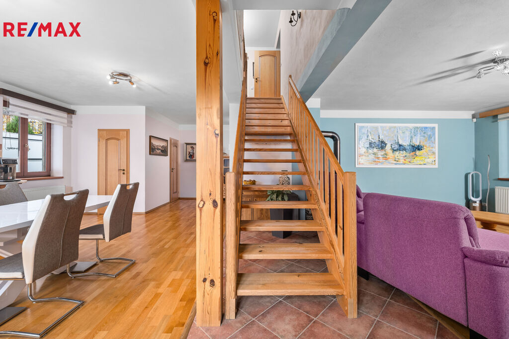 Přízemí: vstupní předsíň, z níž je přístup do garáže i do hlavní obytné části domu. Prostorný obývací pokoj s krbovými kamny je propojen s kuchyní a jídelnou. Dále zde najdete spižírnu a samostatné WC.