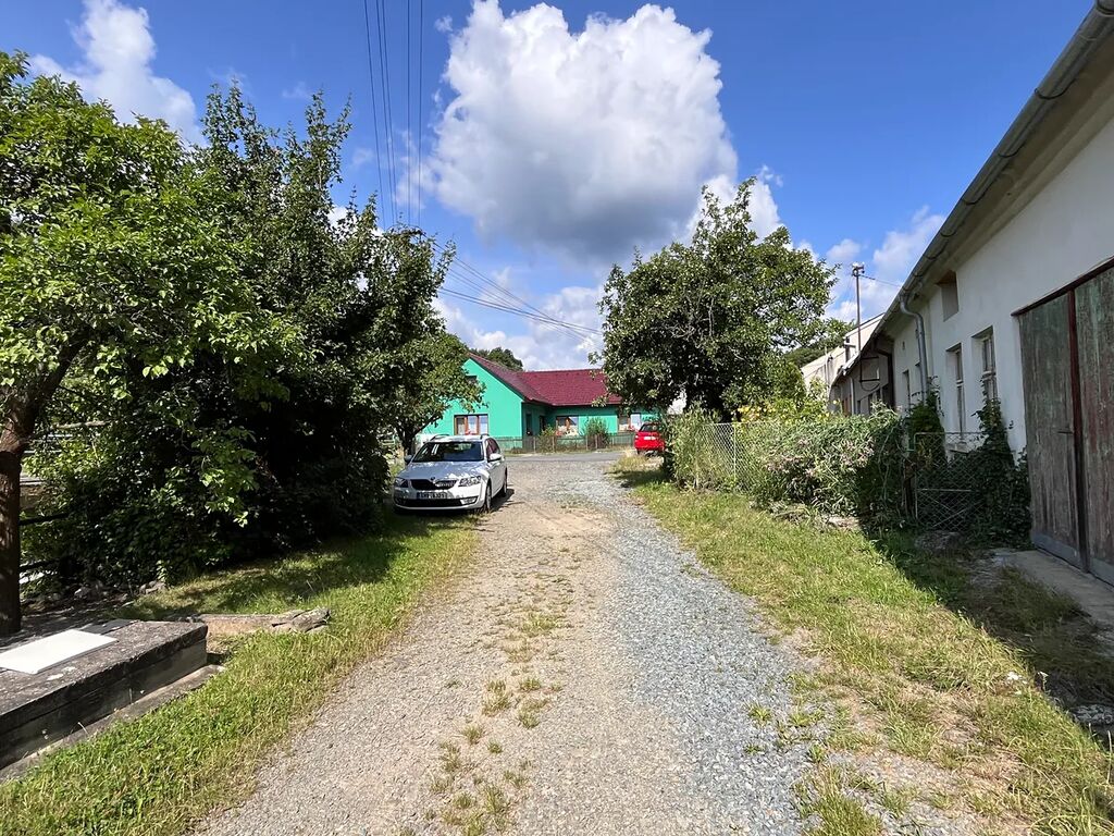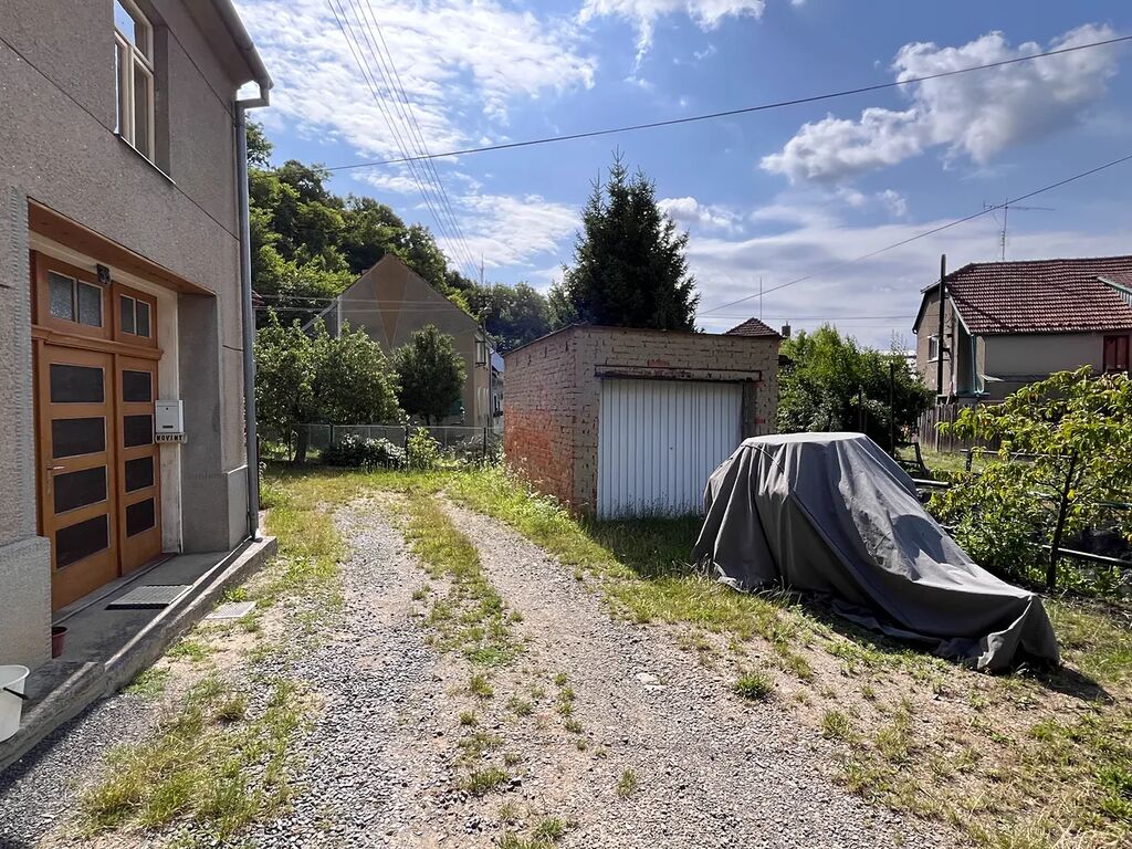 Před domem se nachází travnatá zahrádka se 2 stromy, keřem a studnou, u příjezdové cesty je postavena zděná garáž, za domem po strání je menší dvorek.