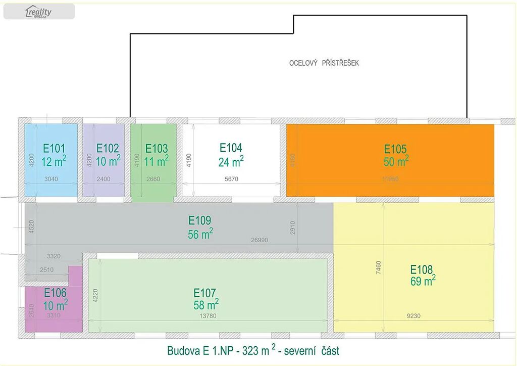 Pronájem části skladového prostoru v 1.NP budovy o rozměrech 27x11 o podlahové ploše 233m2 s výškou stropu 4-7m vhodný jako sklad či výrobní prostor. Jedná se o místnosti E105 (50m2), E109 (56m2), E108 (69m2), E107 (58m2), které je možné pronajmout i samostatně. Prostory jako celek mají vlastní vjezd a uzamykací bránou 3,6m x 3,6m. Po dohodě je možné příčky dle potřeby odstranit a získat tak jeden velký prostor.