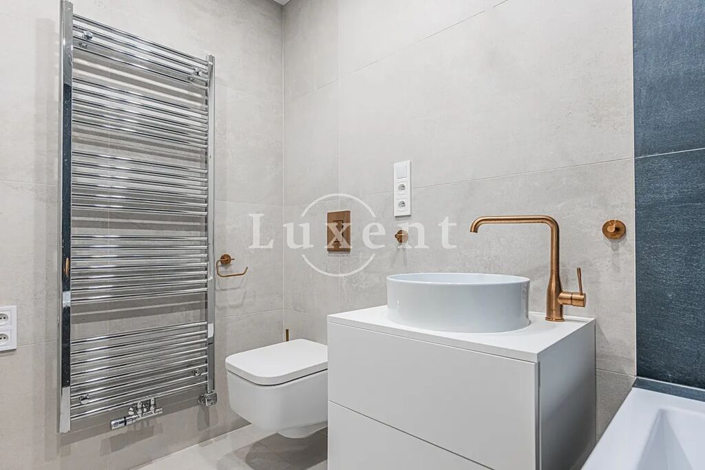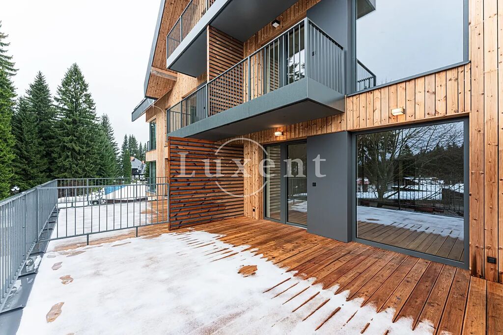 Nabízíme apartmán o dispozici 1-2+kk v 1.NP luxusního projektu HARRACHOV PEAKS. Apartmán má obytnou plochu 52,19 m² a celkovou užitnou plochu 80,16 m² vč. terasy (27,61 m²). V prostoru tohoto apartmánu získáte snadno pomocí připraveného individuálního architektonického návrhu vestavby originální dispozici blížící se 2+kk (viz vizualizace). Terasa apartmánu je vůči zemi vyvýšená a odpovídá 2. NP. Vybavený vzorový byt projektu má stejnou dispozici, takže je možné se inspirovat. Je zařízen kuchyní (spotřebiče BEKO) a skříňová vestavba odděluje spací a jídelní kout a apartmán se tak přibližuje dispozici 2+kk.