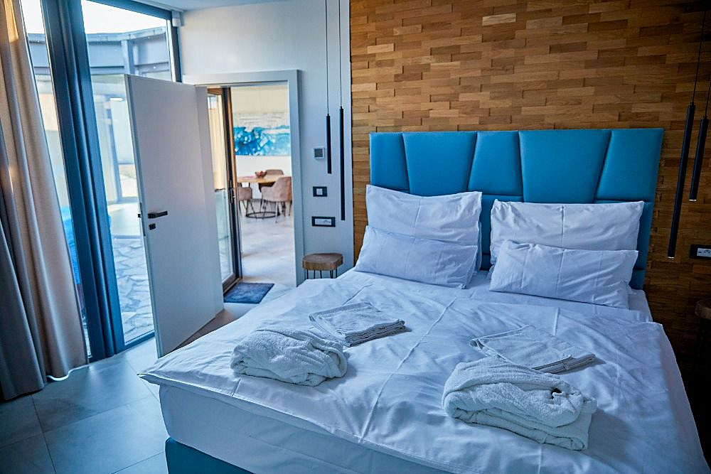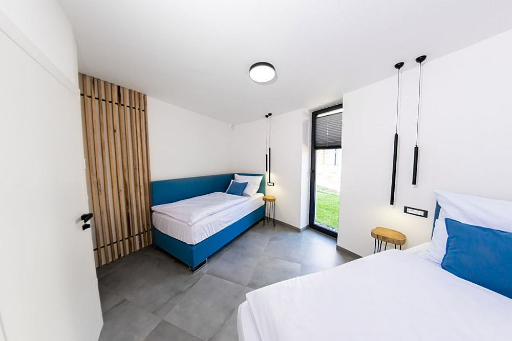 Koupelny jsou vybaveny sprchovým koutem a WC. Z obývacího pokoje je přímý vstup na prostornou slunnou terasu. Na zahradě naleznete také jezírko a Saunu s odpočívárnou. V atriu na Vás čeká vlastní vířivá vana zn. Jacuzzi. Díky luxusnímu vybavení si budete připadat jako v ráji.