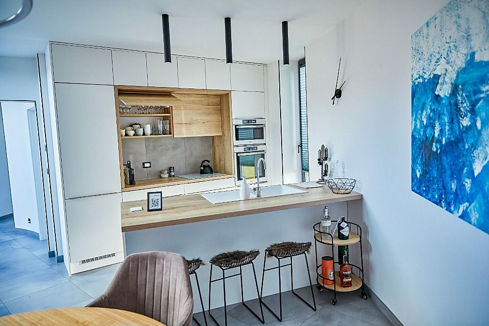 Tato výjimečná nemovitost velikosti 4+kk, disponuje prostorným obývacím pokojem s kuchyňskou linkou včetně plného vybavení. Dále také třemi ložnicemi, z nichž ke každé náleží samostatná koupelna a šatna. Dům se prodává kompletně vybavený.