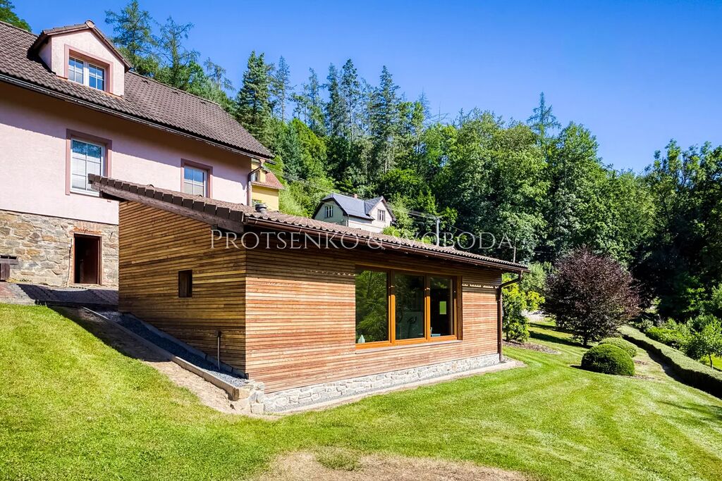 Uvnitř domu vás přivítá obývací pokoj s krbovými kamny, které vnášejí hřejivou atmosféru a pocit skutečného domova. Dvě prostorné garáže nabízejí možnost rozšíření obytné části o další pokoje či ateliér, podle vašich představ. Na pečlivě upraveném pozemku potěší plně funkční udírna pro milovníky poctivé gastronomie, venkovní bazén pro letní osvěžení a samostatný zahradní domek proměněný v privátní wellness zónu s útulnou saunou  – ideální místo k odpočinku a regeneraci.