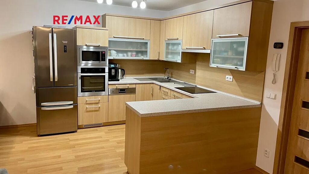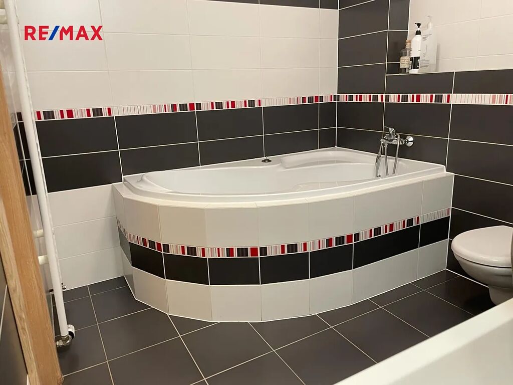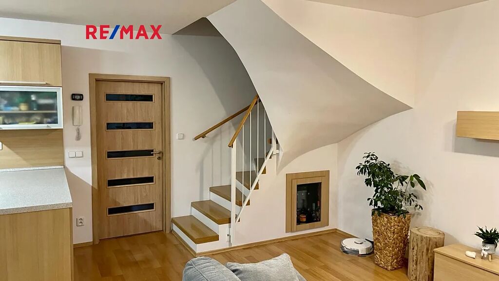 V přízemí domu se nachází prostorný obývací pokoj s kuchyňským koutem a moderní kuchyňskou linkou s  vestavěnými spotřebiči, dále toaleta s umyvadlem, šatna, prádelna a garáž pro jeden osobní automobil. V patře jsou k dispozici čtyři pokoje, šatna a koupelna s vanou a toaletou. Šatna v přízemí a šatna v patře jsou vybaveny vestavěnými skříněmi, stejně jako dva pokoje v patře. Jeden z pokojů v patře lze využívat také jako pracovnu, je zde k dispozici knihovna. V obývacím pokoji  je rozkládací sedací souprava a nábytková obývací stěna (jídelní stůl a židle v obývacím pokoji uvedené na fotografii nejsou aktuálně k dispozici, nicméně stávající nájemce může nabídnout prakticky nový další nábytek - jídelní stůl, postele v pokojích, atd.). Majitel domu neuvažuje o demontáži stávajícího vestavěného nábytku na míru.