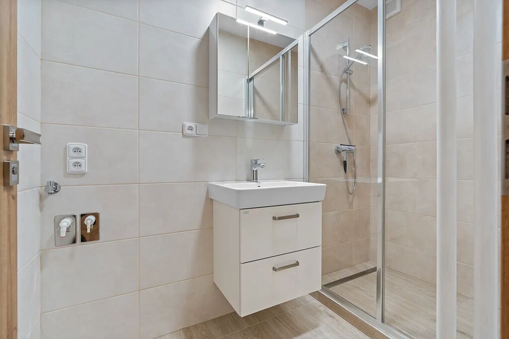 Byt se nachází v 2.NP bez výtahu. Je zde kuchyně se spotřebiči, průchozí obývací pokoj, dále koupelna se sprchovým koutem, umyvadlem a samostatné WC.