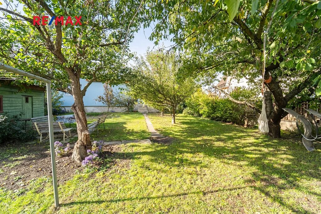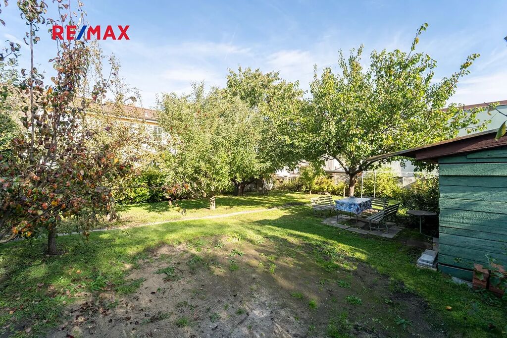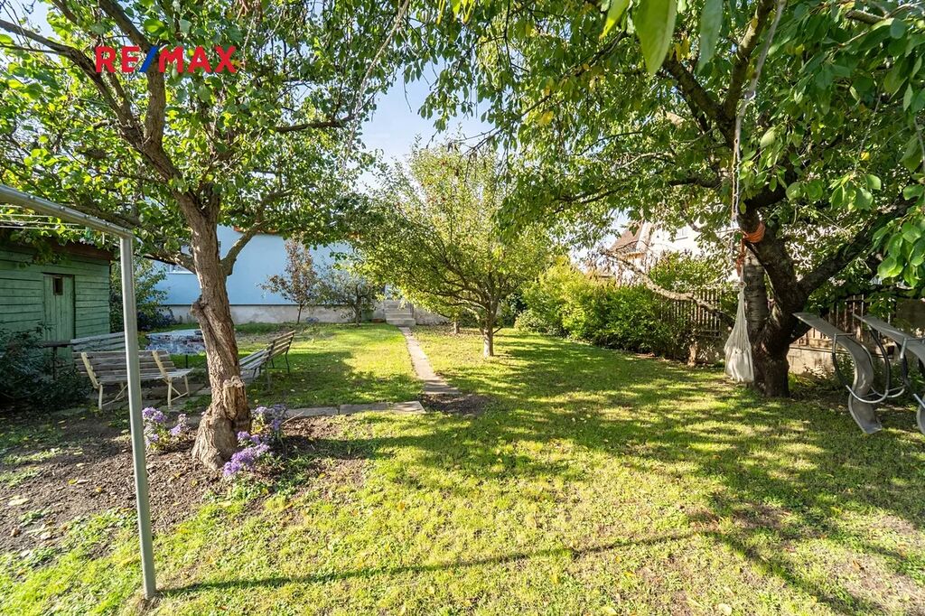 Zahrada u domu o velikosti 303 m2 poskytuje klid a útočiště s posezením pod ovocnými stromy vedle zahradního domku, díky němuž máte kam uklidit vše potřebné pro její údržbu.