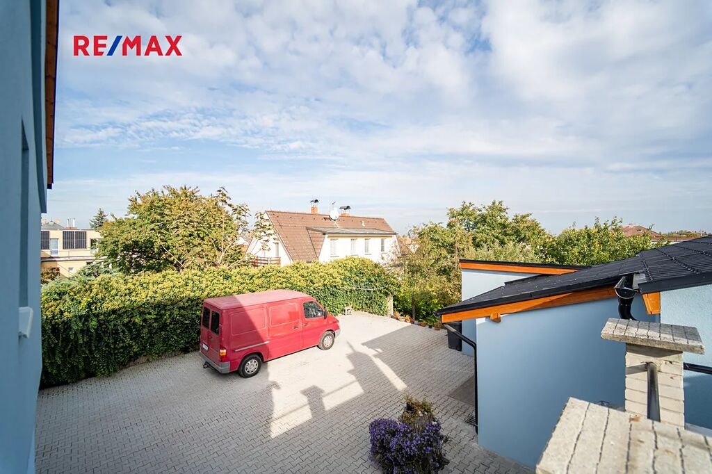 Zastavěná plocha a nádvoří domu o velikosti 358 m2 je osazeno zámkovou dlažbou a umožňuje vjezd na pozemek přímo z ulice Legionářů