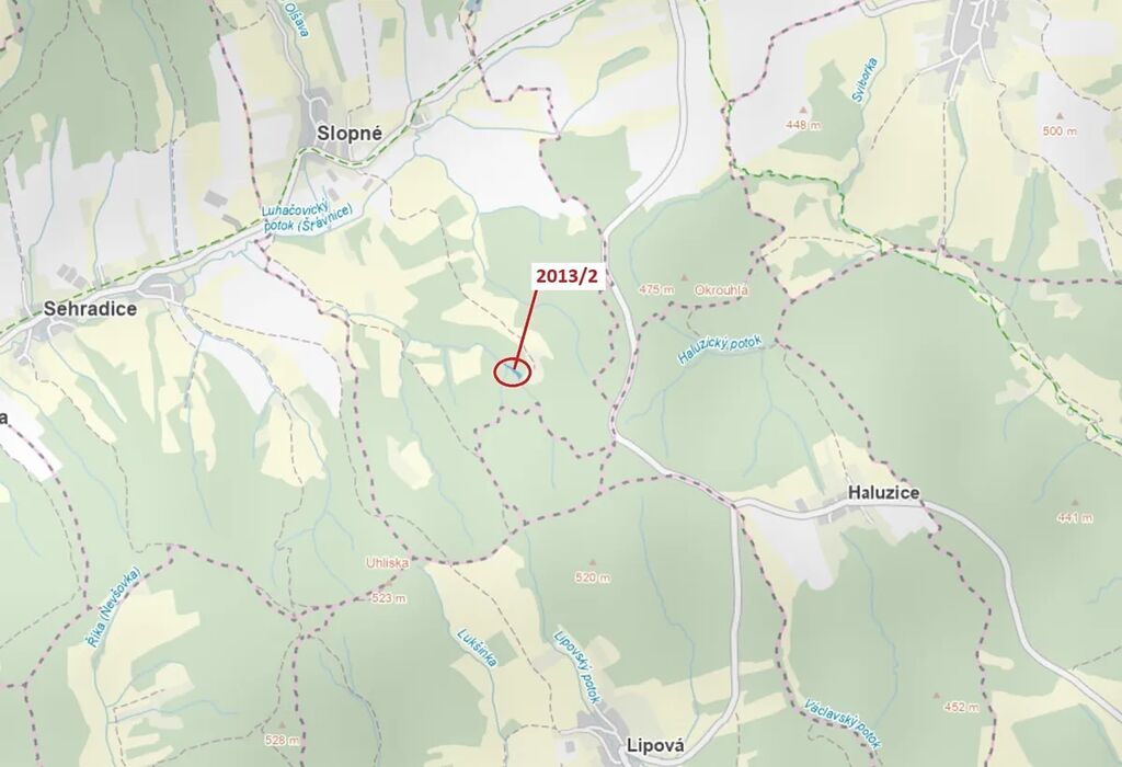 Lesní pozemek o výměře 1363 m2, parcelní číslo 2013/2, podíl 1/1, katastrální území Slopné, obec Slopné, obec s rozšířenou působností Luhačovice, okres Zlín, Zlínský kraj. Po těžbě.