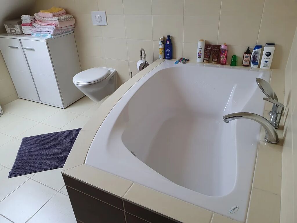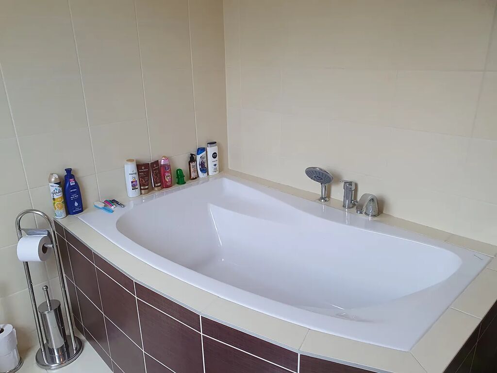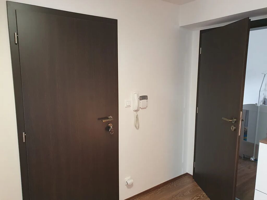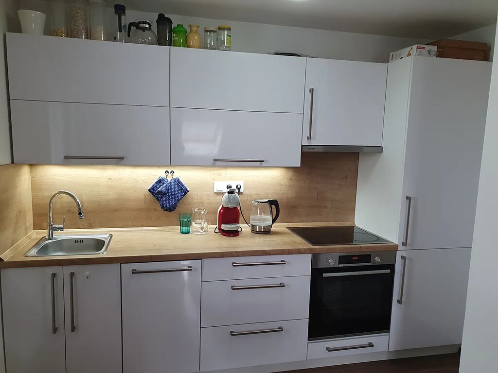 Dispozice a vybavení: Kuchyňský kout s vestavěnými spotřebiči značky Bosch (lednice s mrazákem, trouba, varná deska, myčka, mikrovlnná trouby, digestoř), pohovka, obývací stěna, Smart TV Samsung, stůl 2x, židle 4x. V dalším pokoji jsou 2 noční stolky, vestavná skříň, manželská postel s kvalitní matrací, přikrývkami, polštáři a povlečením. Prostorná koupelna s vanou, pračkou AEG a WC.