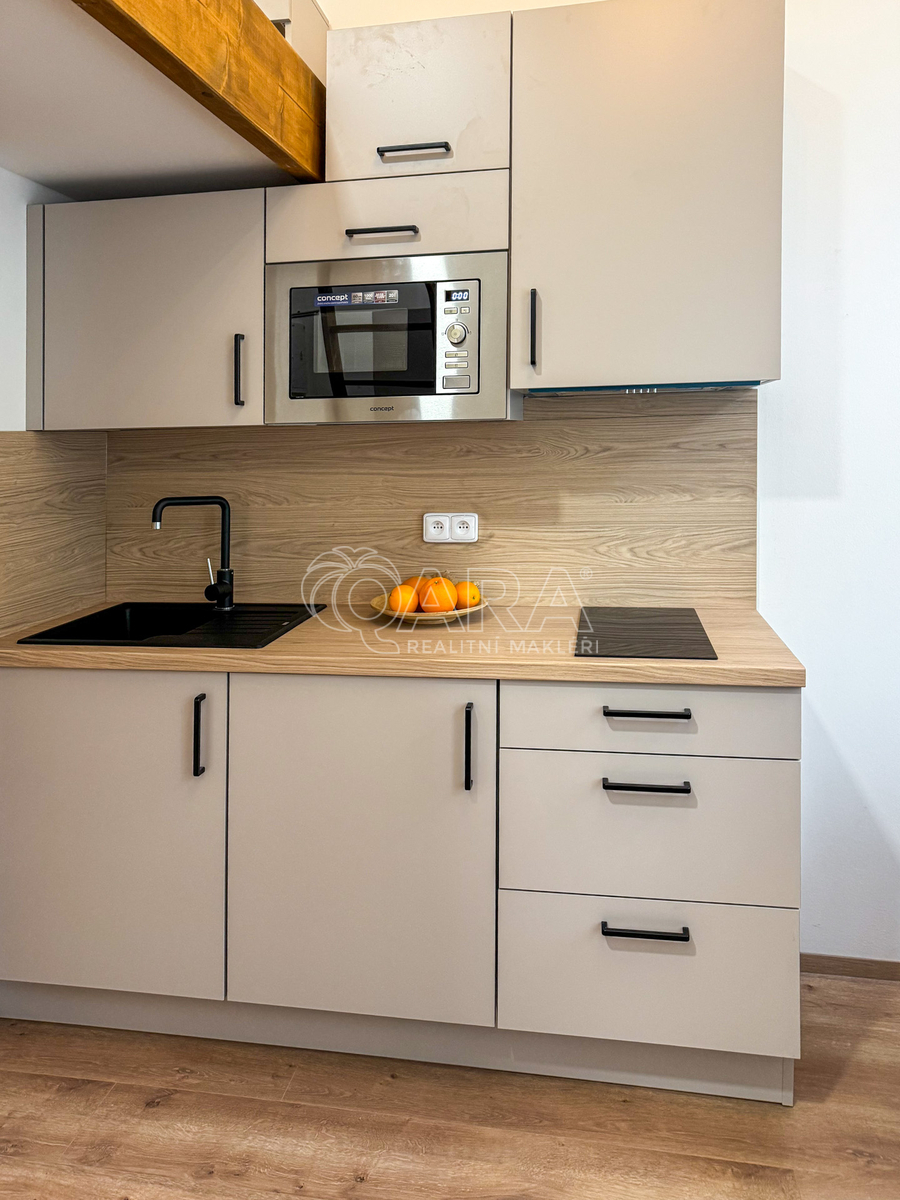 Byt je zařízen kuchyňskou linkou, jídelním stolem se židlemi, pohovkou a šatní skříní se zrcadlem, takže je možné se prakticky ihned nastěhovat. Koupelna s toaletou (3,8 m²) je prostorná v elegantním stylu.