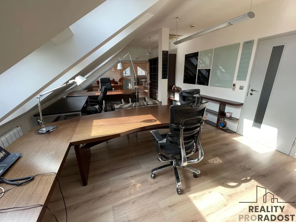Moderní a reprezentativní kanceláře se nachází v 1.patře (podkroví) přízemního domu s odděleným uzamykatelným vchodem. Je zde jeden velký otevřený prostor + 3 samostatné kanceláře. Jsou zařízené nábytkem (kromě jedné místnosti, která sloužila jako sklad nebo archív), k dispozici je sociální zázemí a kuchyňka. Na podlahách dlažba a plovoucí podlahy.