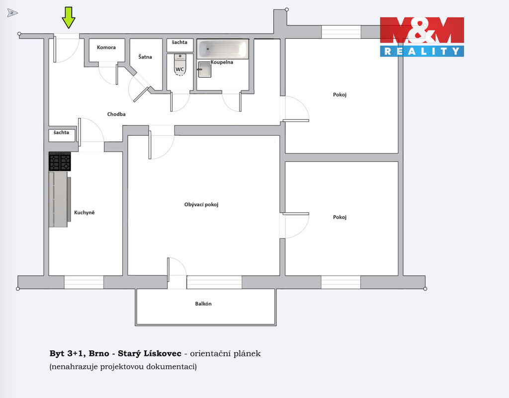 Byt prošel částečnou rekonstrukcí – v roce 2025 byla položena nová podlaha a instalována nová kuchyňská linka. Dispozici tvoří tři obytné pokoje, přičemž obývací pokoj je jediný průchozí a má přímý vstup na balkon. Dále zde najdete kuchyň, koupelnu, samostatné WC, šatnu a komoru.