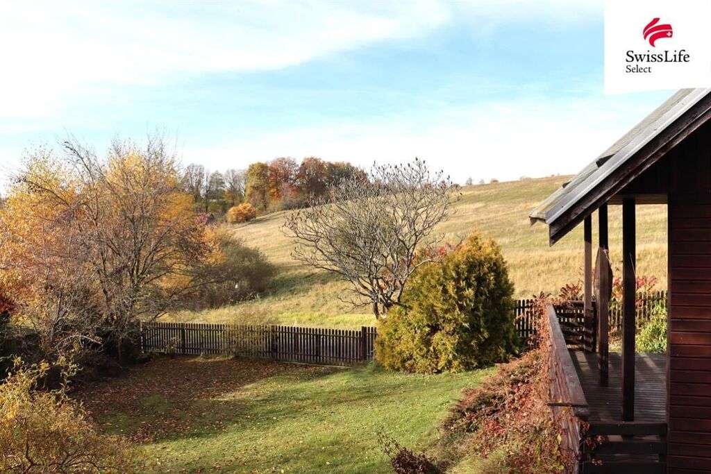 Exteriér: Z chaty vedou dveře na venkovní terasu s krásným výhledem do okolní krajiny. Na chatu navazuje dřevěná přístavba, která slouží jako praktický sklad. Na pozemku je studna.