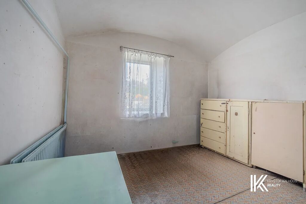 V chodbě se po pravé straně nachází samostatná toaleta a dále v čele chodby stojí koupelna, připravená na kompletní modernizaci. Na vstupní chodbu navazuje vstup do odkloněné části přízemí, začínající chodbou s technickým zázemím, schody do sklepa a schody na půdu. Tato část nabízí obrovský potenciál – z půdy lze vybudovat obytné podkroví s výhledem do krajiny, zatímco sklep může posloužit jako vinárna, sklad potravin či wellness zóna s kamennými klenbami a původními stěnami, které si zachovaly přirozený chlad. Na samotném konci domu pak naleznete poslední velký pokoj, odkloněný lehce stranou. Tento prostor, původně hospodářského charakteru, si přímo říká o přeměnu – může z něj vzniknout ateliér, dílna, nebo další obytná jednotka.