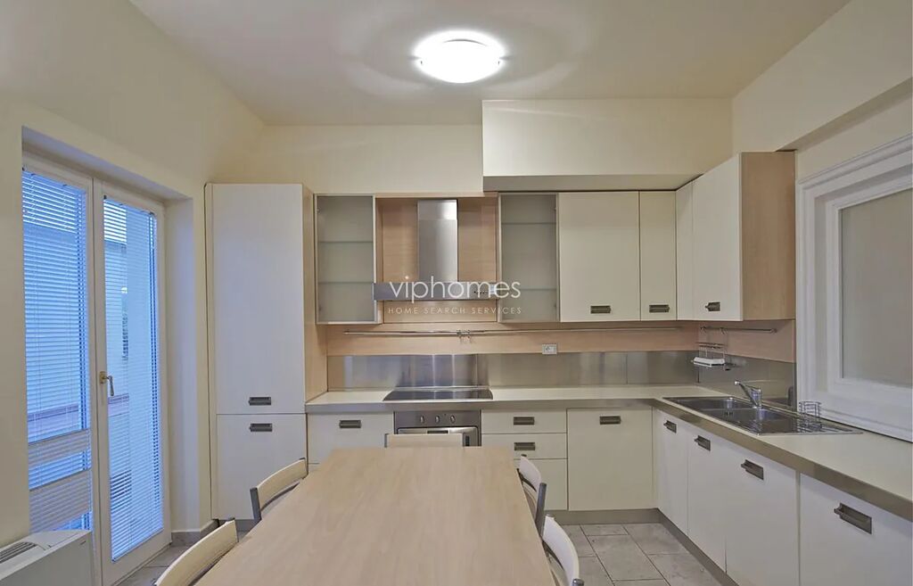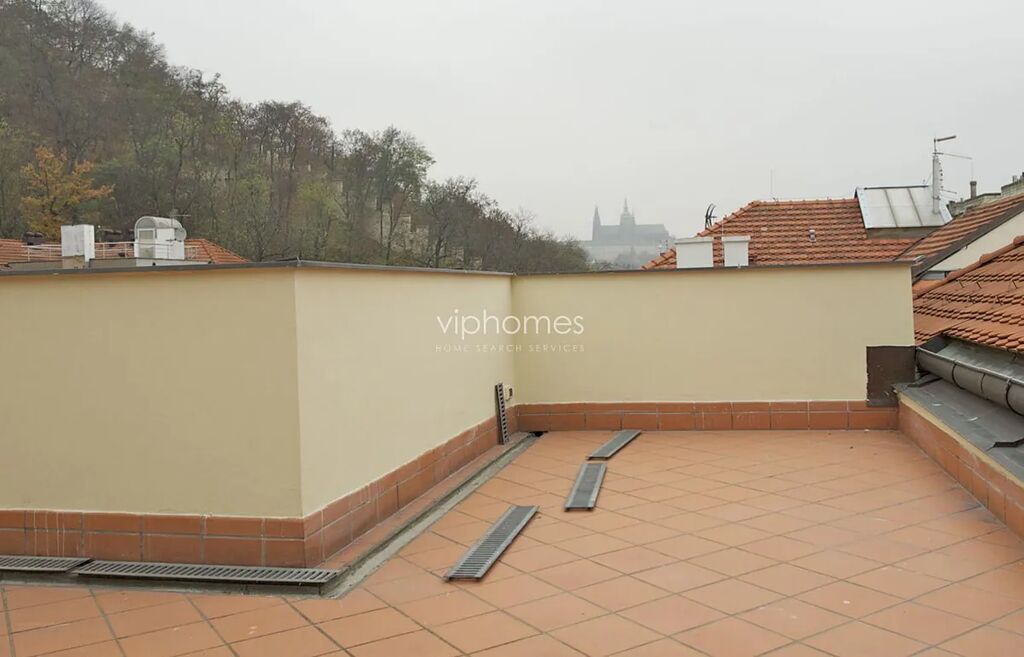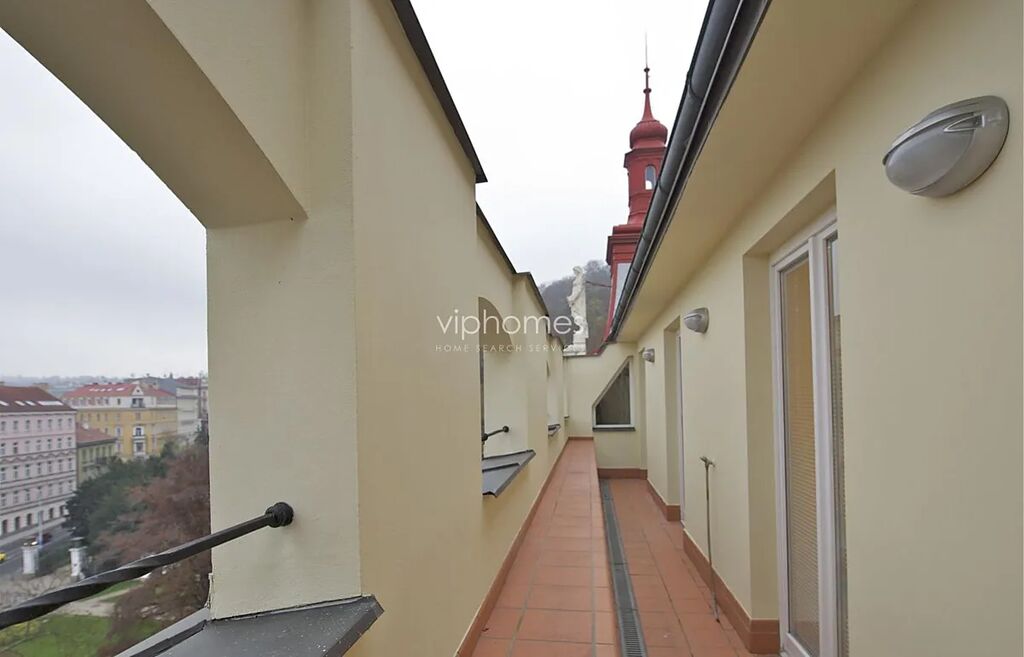 Byt s výhledem na Pražský hrad a Petřín nabízí celkem. 4 ložnice, 3 koupelny,V úrovni vchodu ( spodní patro bytu nabízí vzdušný obývací pokoj s 8 m vysokým klenutým stropem, kompletně vybavenou kuchyň s balkonem a hezkým výhledem na nám. Kinských, hlavní ložnici s vlastní koupelnou (obklady mramor, Jacuzzi), vybavenou šatnou, 2.další koupelny a 2 ložnice s balkonem, šatnu a technické zázemí. V patře je umístěna 4 místnost / 4. ložnice s velkou terasou.