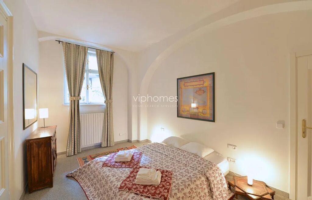 Byt i dům prošel kompletní rekonstrukci, tak aby byl atraktivní pro dnešní zájemce o moderní bydlení. Byt nabízí velkou vstupní halu, prostorný obývací pokoj spojený s jídelním koutem, plně vybavenou kuchyň, 1 ložnici, koupelnu ze zapuštěnou kruhovou vanou, šatnu. Terasa o velikosti 11 m2, malá zahrádka. Stylové zařízení s orientálními koberci, dlažba, satelitní TV připojení. Možnost zařídit parkování 300 m od domu.