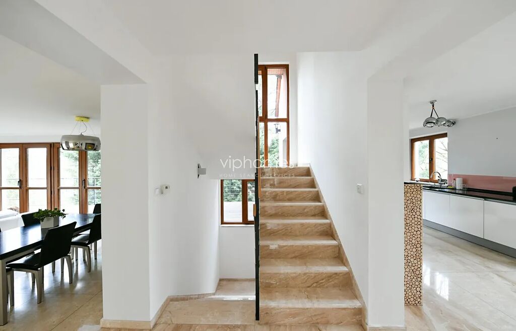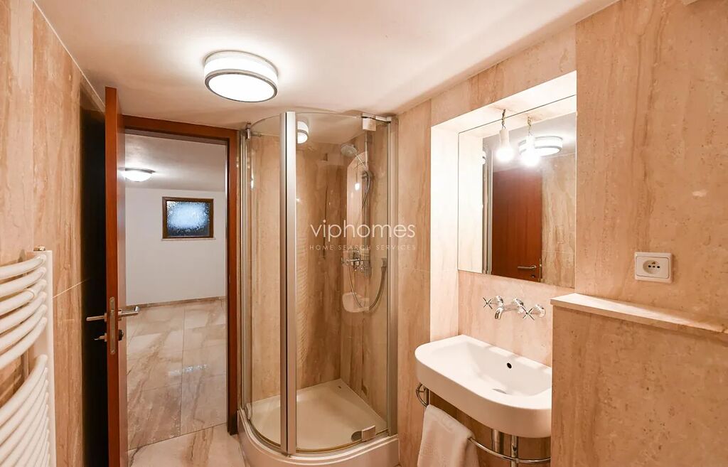 V úrovni svažité zahrady je umístěn prostorný obývací pokoj s krbem, kuchyně vybavena spotřebiči (vstup na terasu), šatna a samostatná toaleta. V patře se nachází hlavní ložnice s koupelnou, (vana, sprchový kout, toaleta a bidet), další ložnice s koupelnou (sprcha a toaleta), centrální chodba, balkon. V obytném suterénu je situován velký pokoj s flexibilním využitím, pracovna, šatna, sauna, koupelna se sprchou a toaletou, technická místnost, vchod na zahradu.
