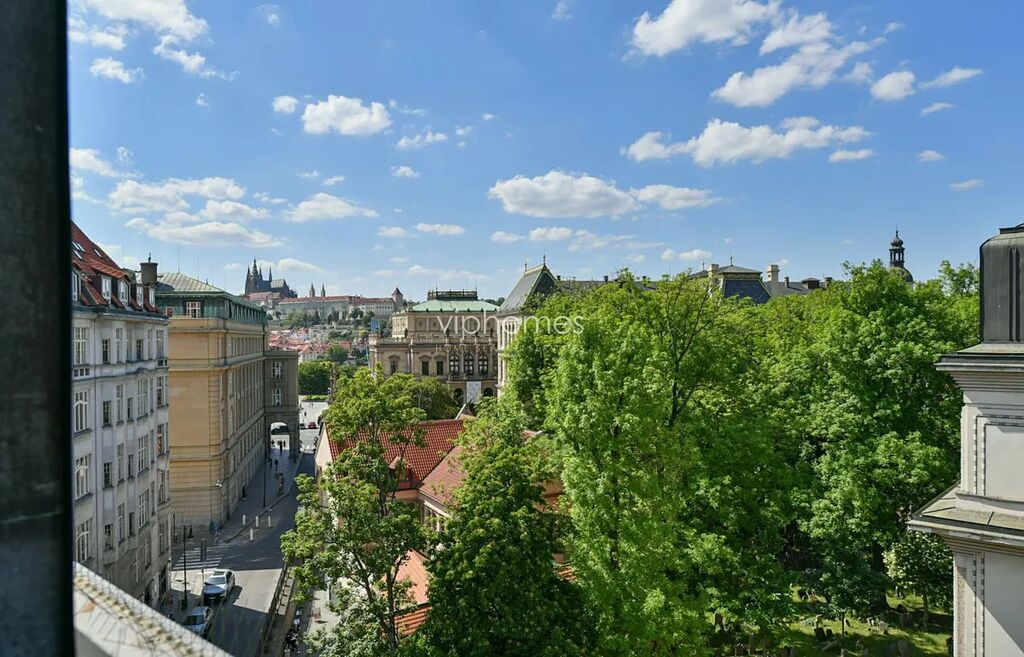 Vysoké stropy, repasované dubové parkety. 24hodinová recepce, možnost parkování v nedalekých garážích Rudolfina.