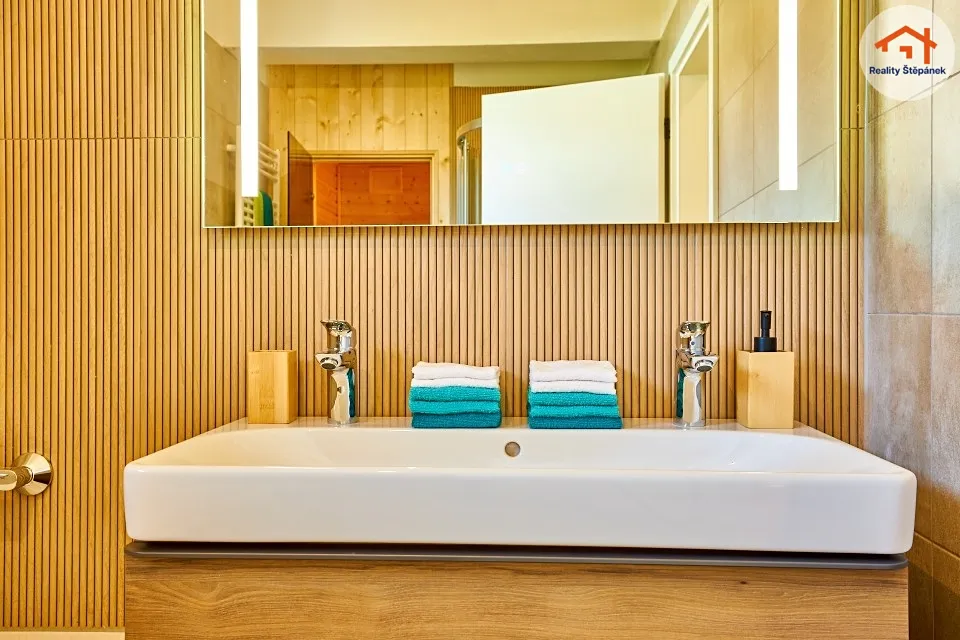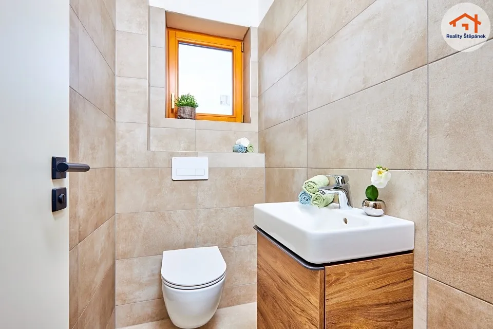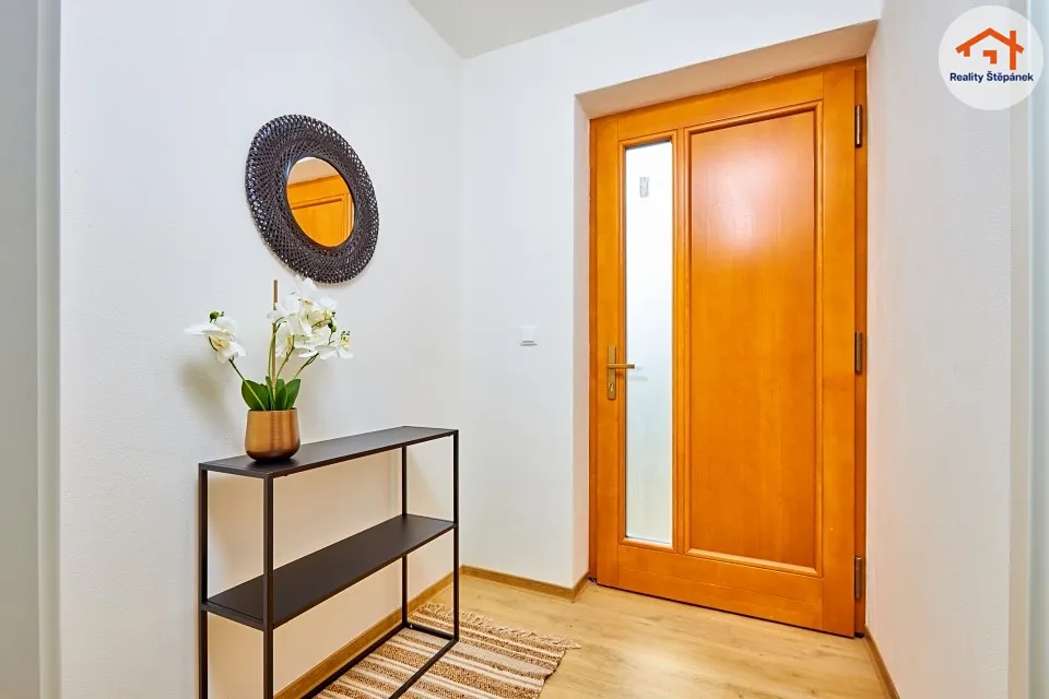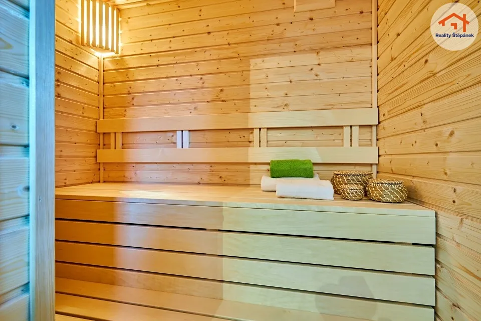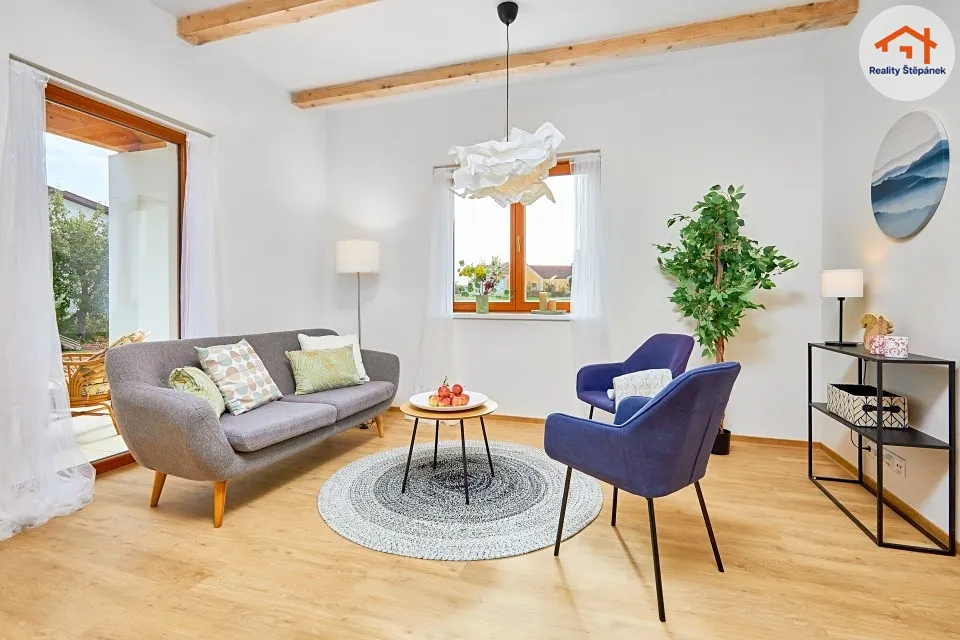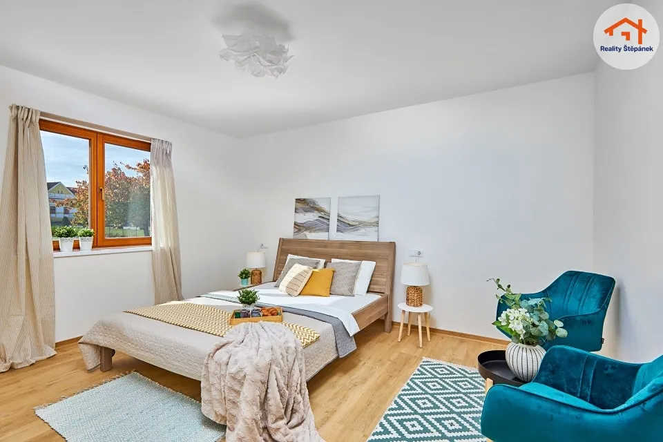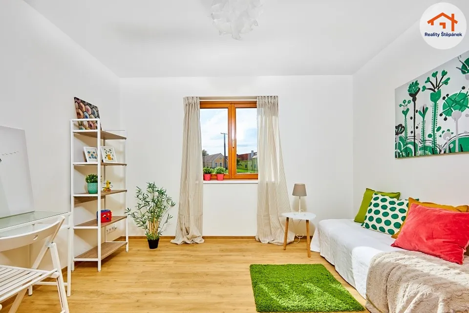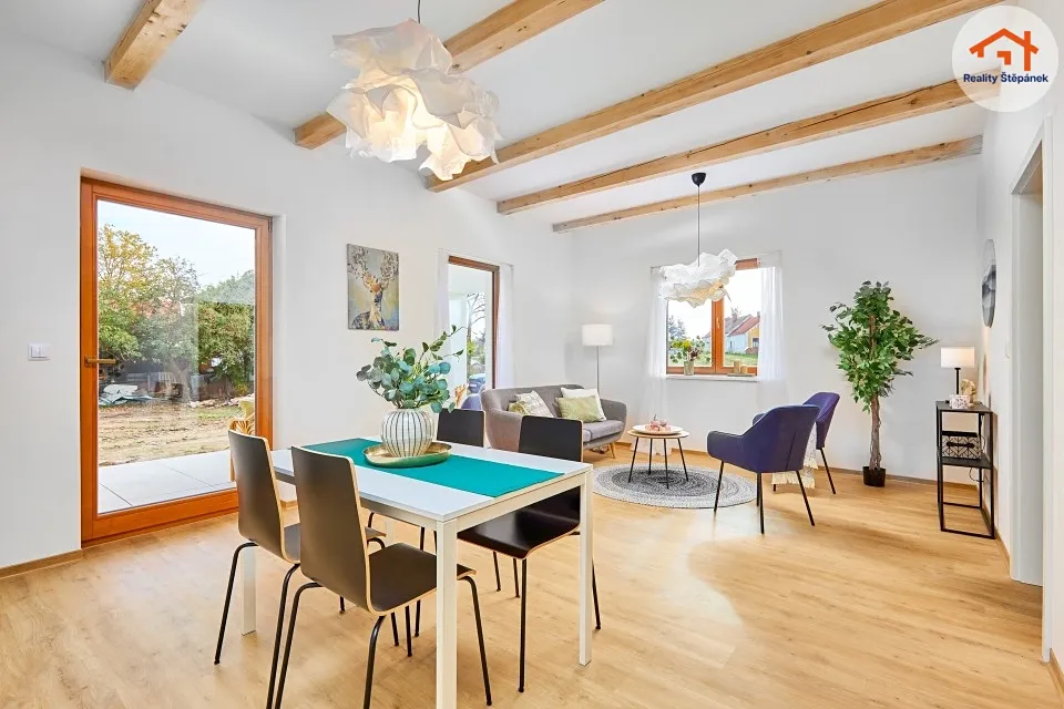 Dům tvořený jedním nadzemním podlažím nabízí obytnou plochu 115 m² s prostorným obývacím pokojem se zvýšenými stropy a odhalenými trámy, třemi ložnicemi, pracovnou, předsíní, prádelnou, technickou místností a chodbou. Z obývacího pokoje je možné vyjít na zastřešenou terasu o ploše 16,55 m² s přímým vstupem do zahrady. Dům se může dále pyšnit lepenými vinylovými podlahami, kvalitní koupelnou s broušeným obklady, nebo saunou na míru.