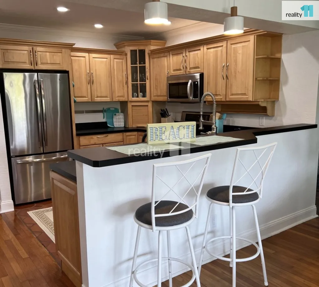 Zrekonstruovaná kuchyně s nerezovými spotřebiči: myčka, sušička, drtič odpadu, mikrovlnka, sporák / trouba, lednice, pračka.