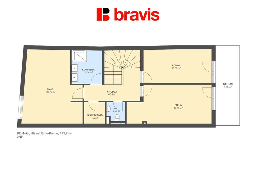 V patře se nachází druhá koupelna se sprchovým koutem o rozloze (6 m²) a samostatná toaleta o velikosti (3 m²).