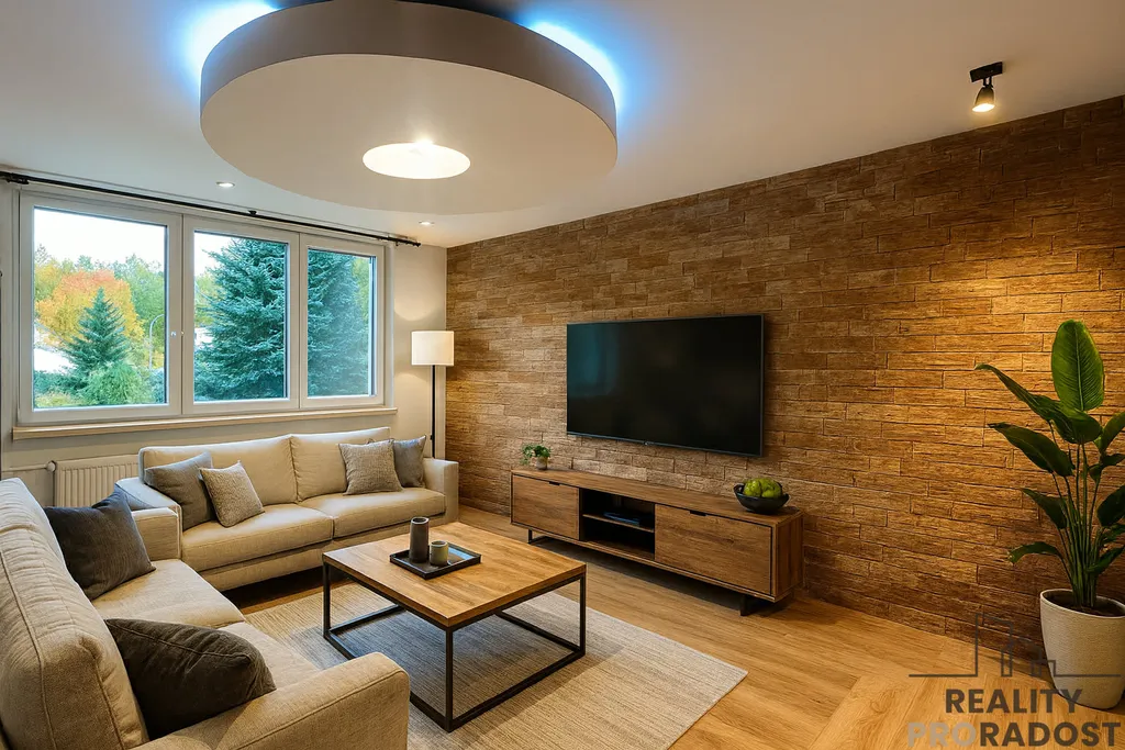 Byt je světlý, útulný a po rekonstrukci, která zahrnovala nová plastová okna, elektroinstalaci, rozvody vody a odpadu, nové omítky, plovoucí podlahy.