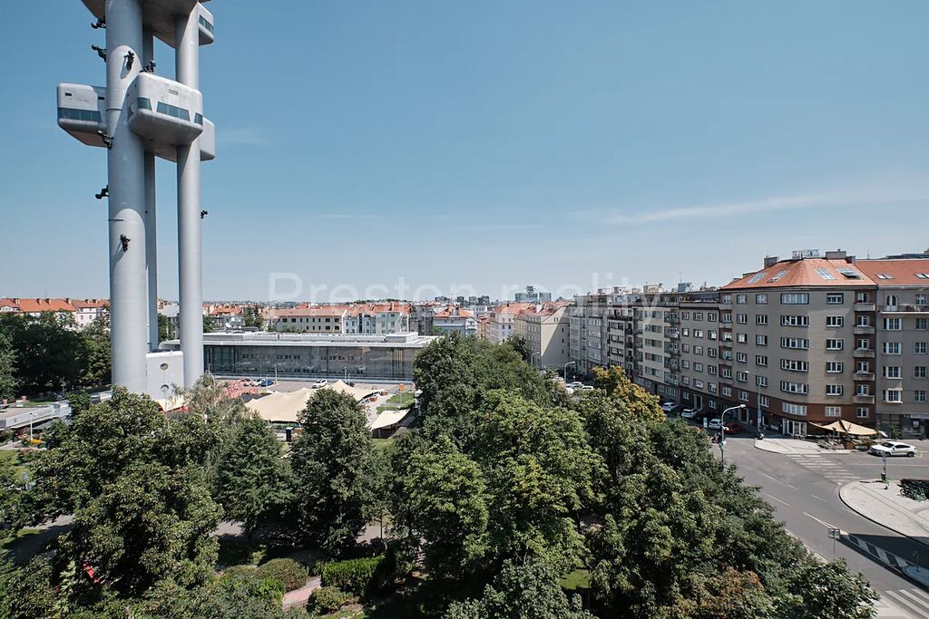 Nabízíme exkluzivně k pronájmu hezký byt 3+kk, 72 m2 ve vyhledávané lokalitě Vinohrad, přímo u parku Žižkovské věže (Mahlerovy sady) v bezprostřední blízkosti nám. Jiřího z Poděbrad. Byt je umístěn v 5. patře udržovaného činžovního domu s výtahem. Byt se skládá z obývacího pokoje (23 m2), ve které je umístěná kompletně vybavená kuchyňská linka (sklokeramická varná deska, trouba, mikrovlnná trouba, myčka, digestoř), volně stojící lednice s mrazákem a kuchyňský stůl s židlemi. Z okna obývacího pokoje (kuchyně) jsou nádherné výhledy na park s Žižkovskou věží (východní orientace). Další dva samostatné pokoje mají západní orientaci do klidného vnitrobloku s plochou 17 a 15 m2. Menší z nich je částečně vybaven nábytkem (historická knihovna. Psací stůl na fotografiích byl již odvezen) a má přístup do malé uzamykatelné komory. Větší pokoj má k dispozici šatní skříň a velkoplošnou TV.
