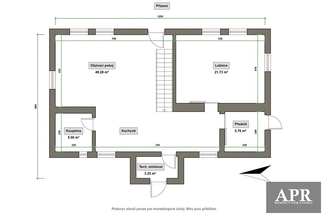 1:NP ( 85,08 m2 ) předsíň, velký obývací pokoj s kachlovými kamny, plně vybavená kuchyň, samostatná ložnice, technická místnost, koupelna, WC.