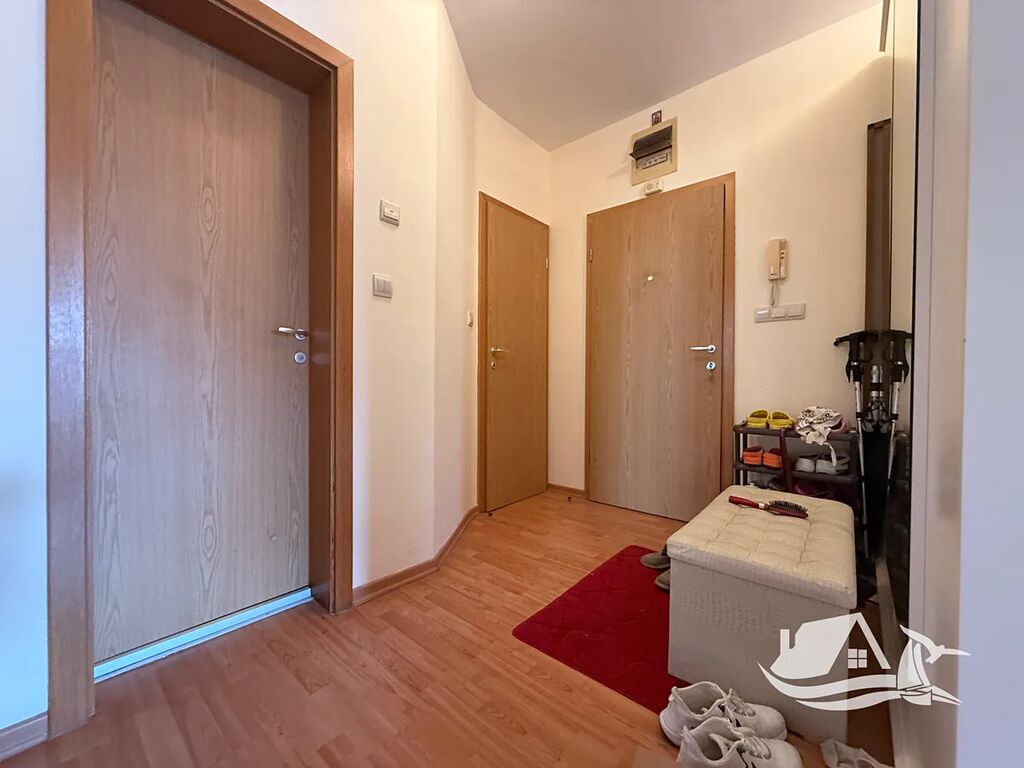 Dispozice bytu je promyšlená a praktická: vstupní hala vás přivítá a vede do otevřeného obytného prostoru, kde pohodlně využijete jídelní stůl i relaxační část. Kromě obývacího pokoje zde najdete dvě ložnice, moderní koupelna a balkon s jižní orientací, kde si můžete užívat každé ráno probouzející se pobřeží.