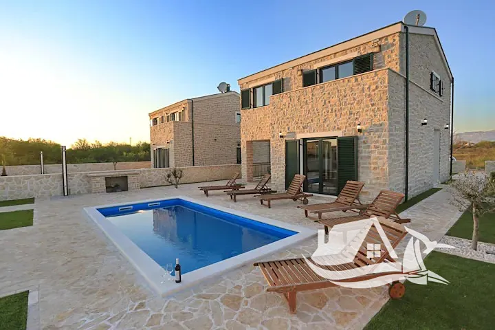 Nabízíme k prodeji plně zařízený dvoupodlažní dům s bazénem v Privlaka, pouhých 250 metrů od pláže. Tento moderní dům o celkové ploše 155 m² je situován na pozemku o rozloze 450 m² a byl postaven v roce 2016.