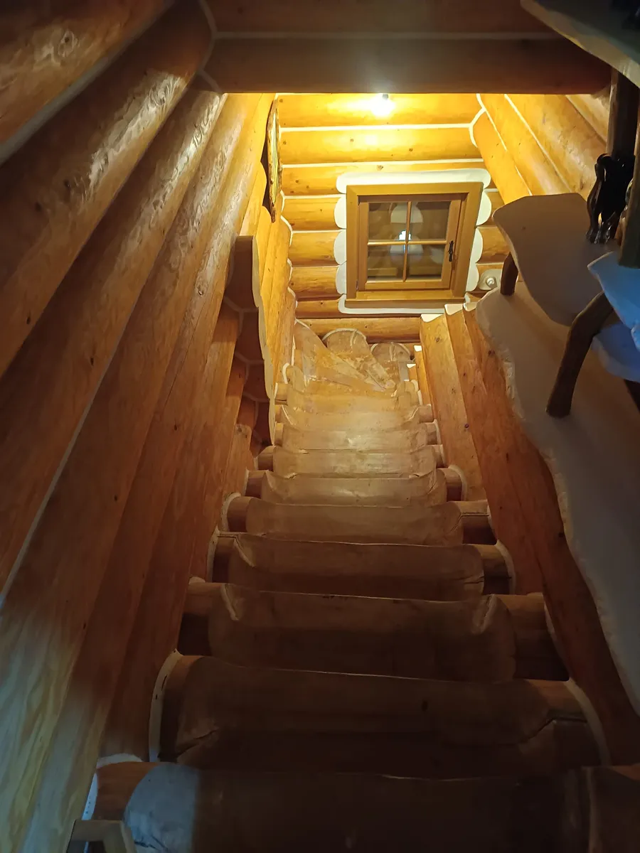 Tento luxusní dvoupodlažní dřevěný srub kombinuje rustikální kouzlo s moderním komfortem. Viditelné dřevěné trámy a sloupy dodávají interiéru jedinečný estetický vzhled a zajišťují vysokou kvalitu celé stavby. Ložnice s balkony v 1.P. poskytují nádherný výhled na okolní přírodu a zajišťují dostatek přirozeného světla a klidu. V obývacím pokoji se nachází stylový krb, který vytápí i celý dům a dodává prostoru útulnost a teplo, ideální pro zimní večery strávené v kruhu rodiny.
