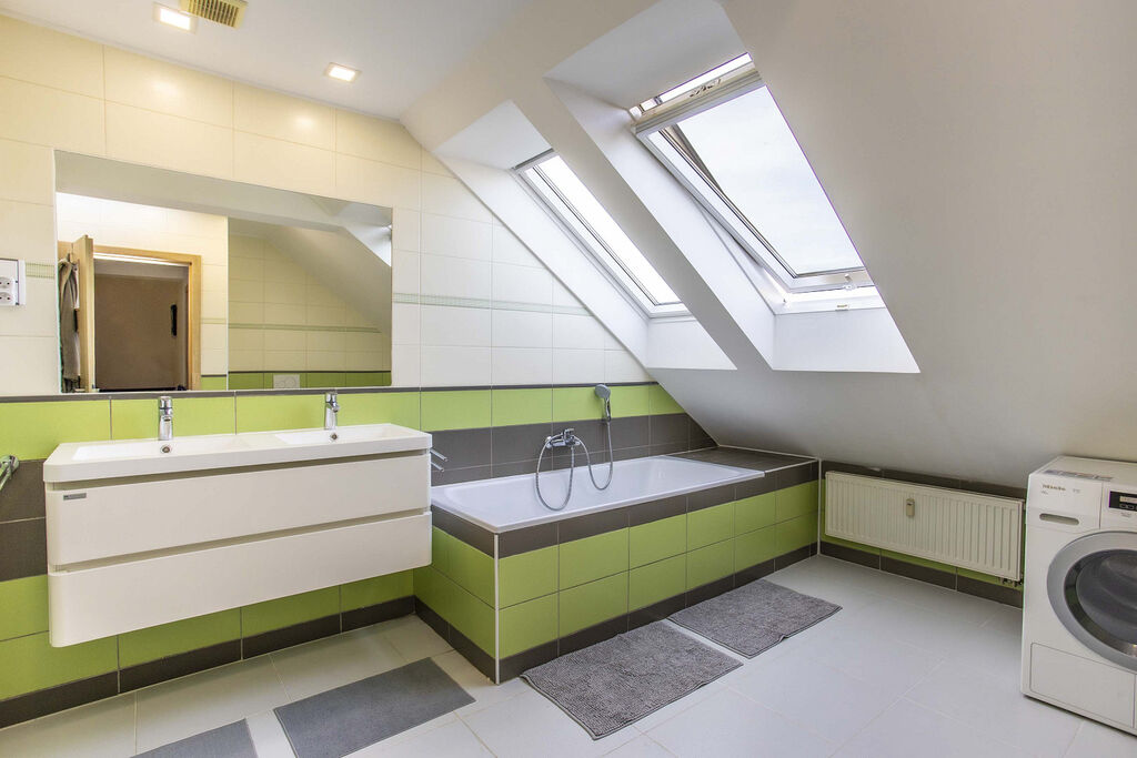 Prostorná koupelna s vanou, dvojumyvadlem a WC