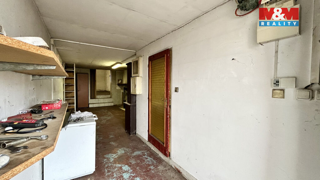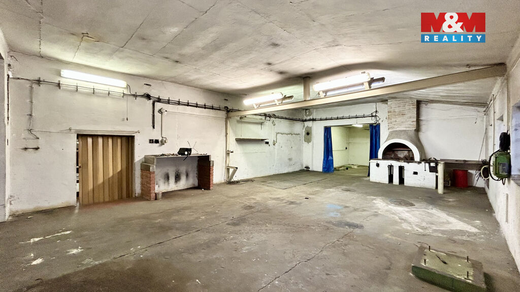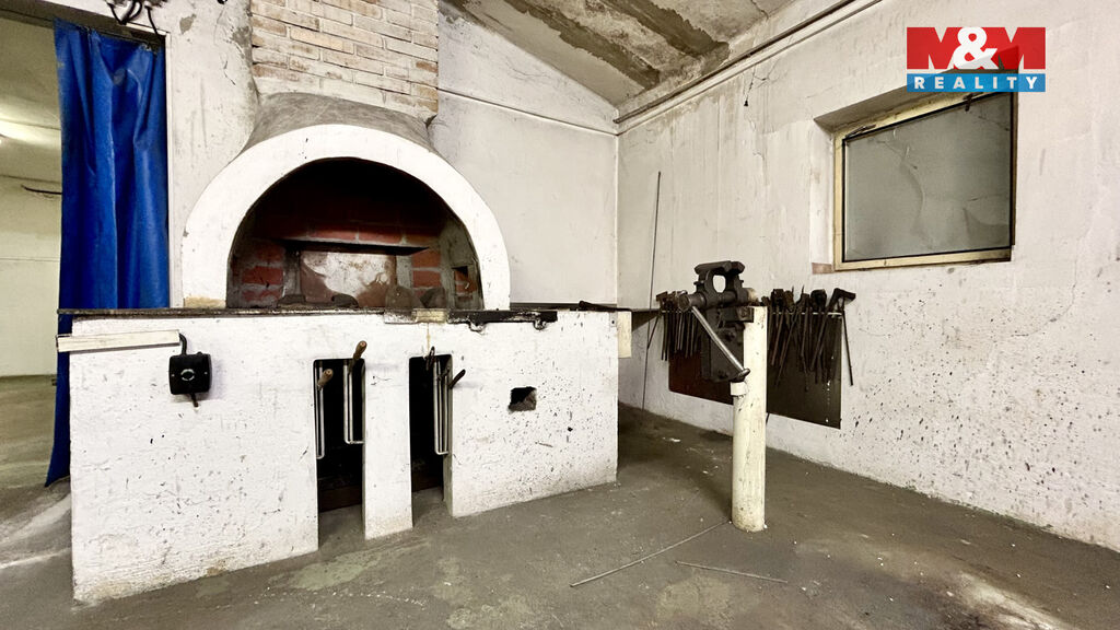 - Navazující dílna / autoservis (196 m²) – s velkými vraty, funkční kovářskou pecí a montážní jámou.