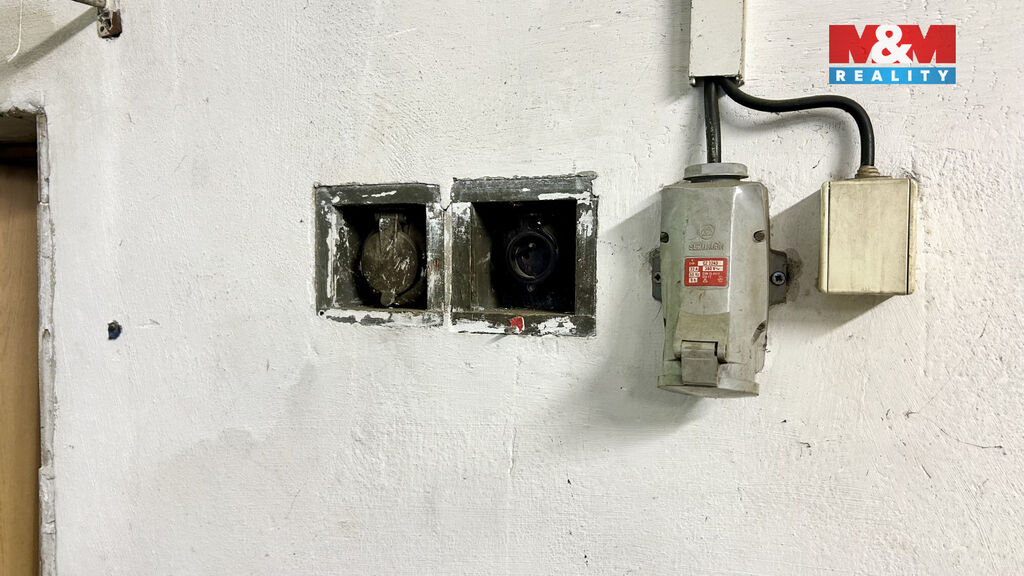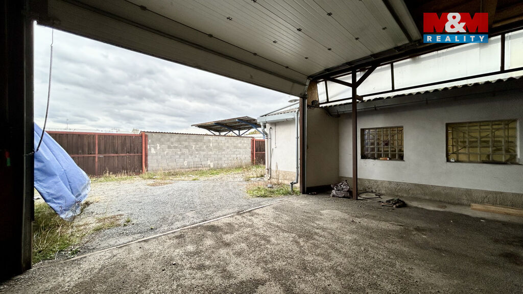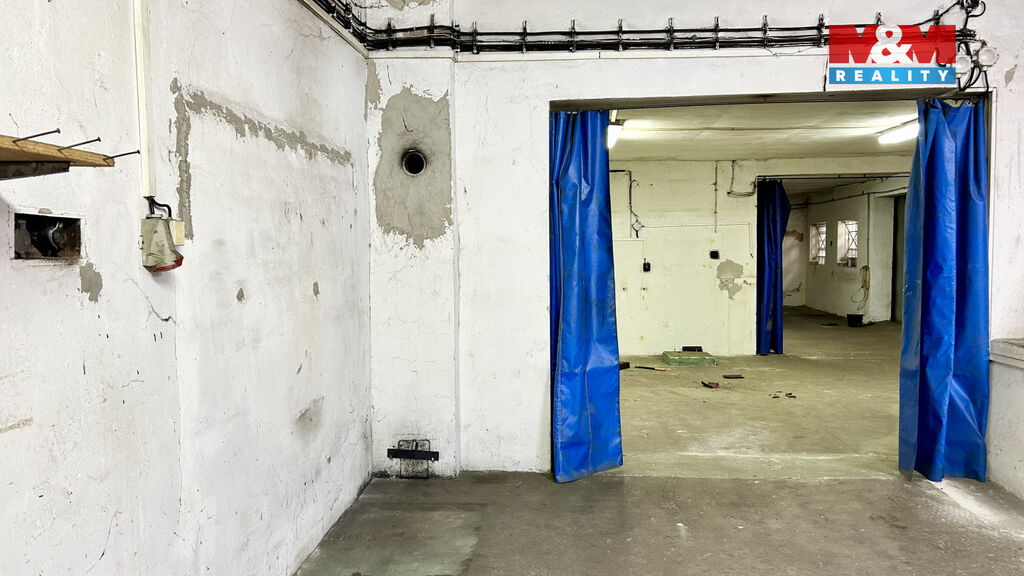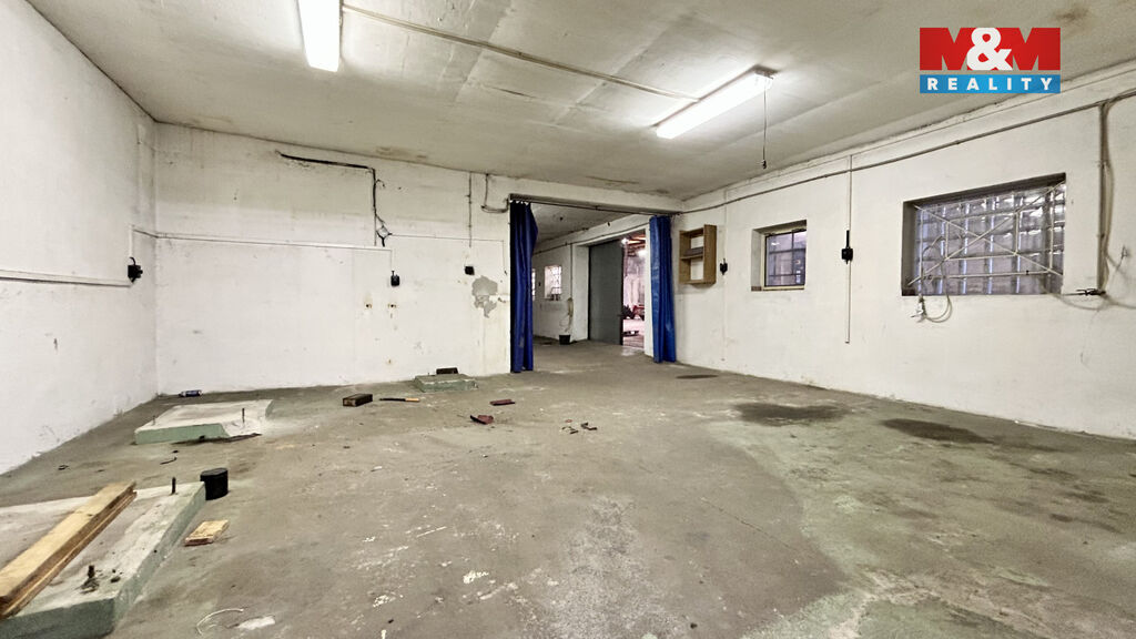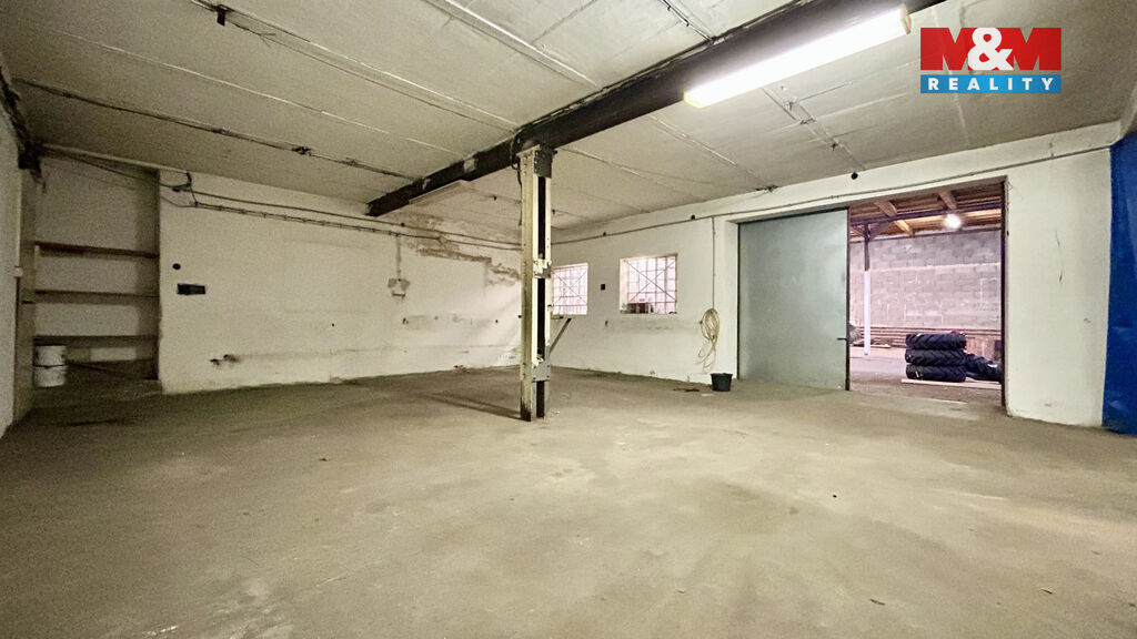 - Skladová hala (491 m²) s vysokými stropy a velkými sekčními vraty pro vjezd kamionu.
