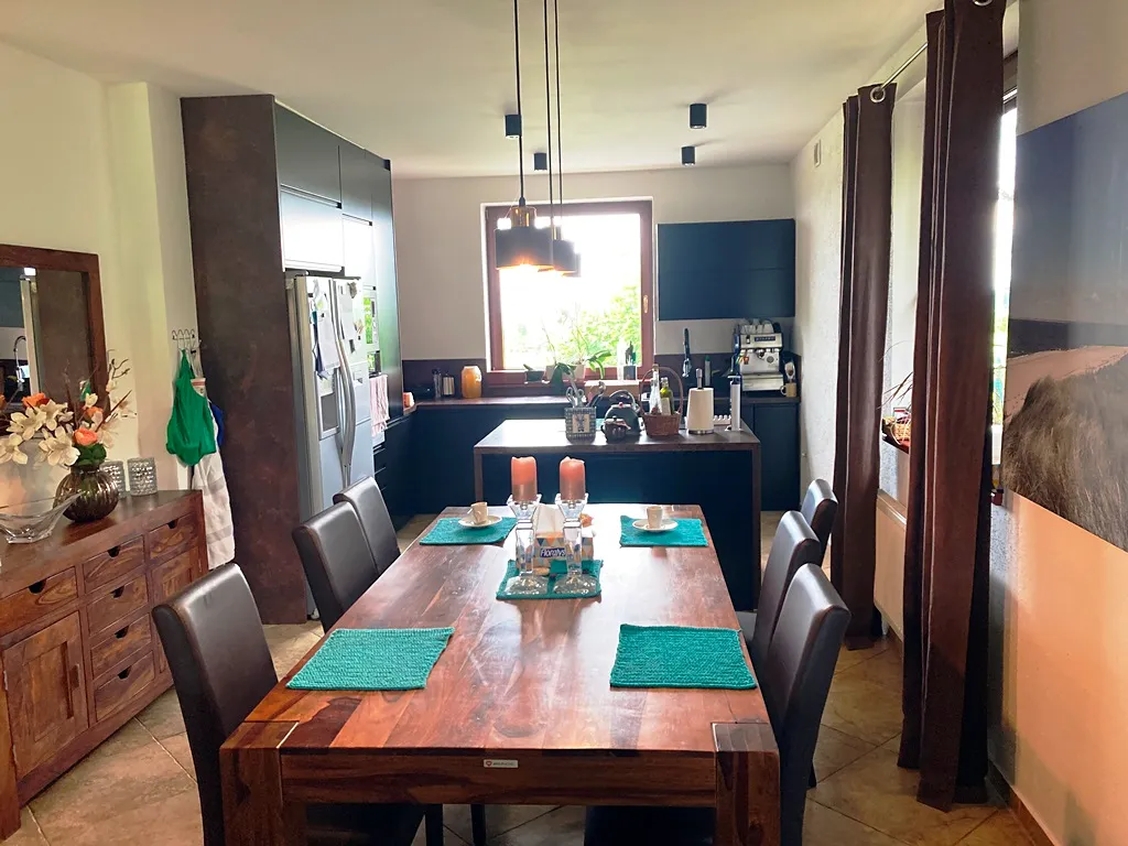 Obytný prostor je příjemně světlý díky oknům na tři světové strany. Obývací část volně přechází v jídelní část a dále pak pokračuje část kuchyně. Dům se nabízí s plně vybavenou kuchyní ( vč americké lednice).