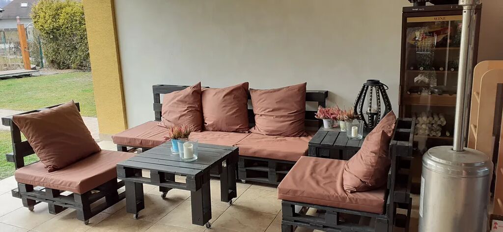 Obývací pokoj je velmi prostorný. Francouzskými okny se z něj vychází na velkou(43 m²) zastřešenou terasu, na které si můžete posedět nejen v létě, ale i v zimním chladném období, a to díky plynové lampě s vytápěním.